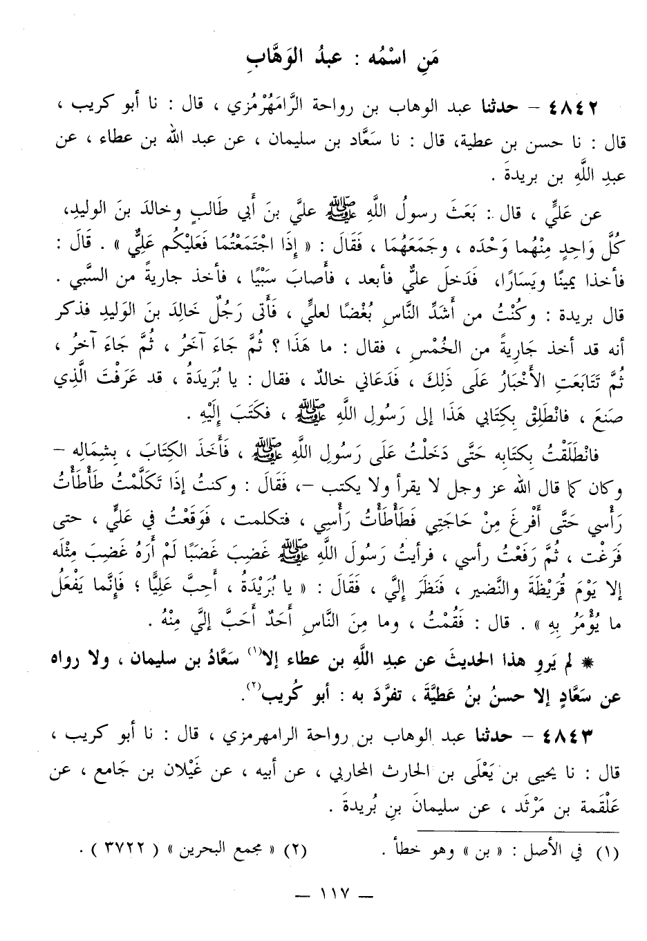4842 - حَدَّثَنَا عَبْدُ الْوَهَّابِ بْنُ رَوَاحَةَ الرَّامَهُرْمُزِيُّ قَالَ: نَا أَبُو كُرَيْبٍ قَالَ: نَا حُسْنُ بْنُ عَطِيَّةَ قَالَ: نَا سُعَادُ بْنُ سُلَيْمٍانَ، عَنْ عَبْدِ اللَّهِ بْنِ عَطَاءٍ، عَنْ عَبْدِ اللَّهِ بْنِ بُرَيْدَةَ، عَنْ عَلِيٍّ قَالَ: بَعَثَ رَسُولُ اللَّهِ صَلَّى اللهُ عَلَيْهِ وَسَلَّمَ عَلِيَّ بْنَ أَبِي طَالِبٍ وَخَالِدِ بْنِ الْوَلِيدِ، كُلَّ وَاحِدٍ مِنْهُمَا وَحْدَهُ وَجَمَعَهُمَا، فَقَالَ: «إِذَا اجْتَمَعْتُمَا فَعَلَيْكُمْ عَلِيٌّ» . قَالَ: فَأَخَذَا يَمِينًا وَيَسَارًا، فَدَخَلَ عَلِيٌّ فَأَبْعَدَ، فَأَصَابَ سَبْيًا، فَأَخَذَ جَارِيَةً مِنَ السَّبْيِ. قَالَ بُرَيْدَةُ: وَكُنْتُ مِنْ أَشَدِّ النَّاسِ بُغْضًا لِعَلِيٍّ، فَأَتَى رَجُلٌ خَالِدَ بْنَ الْوَلِيدِ فَذَكَرَ أَنَّهُ قَدْ أَخَذَ جَارِيَةً مِنَ الْخُمْسِ، فَقَالَ: مَا هَذَا؟ ثُمَّ جَاءَ آخَرُ، ثُمَّ جَاءَ آخَرُ، ثُمَّ تَتَابَعَتِ الْأَخْبَارُ عَلَى ذَلِكَ، فَدَعَانِي خَالِدٌ، فَقَالَ: يَا بُرَيْدَةُ، قَدْ عَرَفْتَ الَّذِي صَنَعَ، فَانْطَلِقْ بِكِتَابِي هَذَا إِلَى رَسُولِ اللَّهِ صَلَّى اللهُ عَلَيْهِ وَسَلَّمَ، فَكَتَبَ إِلَيْهِ. فَانْطَلَقَتُ بِكِتَابِهِ حَتَّى دَخَلْتُ عَلَى رَسُولِ اللَّهِ صَلَّى اللهُ عَلَيْهِ وَسَلَّمَ، فَأَخَذَ الْكِتَابَ، بِشِمَالِهِ وَكَانَ كَمَا قَالَ اللَّهُ عَزَّ وَجَلَّ لَا يَقْرَأُ وَلَا يَكْتُبُ، فَقَالَ: وَكُنْتُ إِذَا تَكَلَّمَتُ طَأْطَأْتُ رَأْسِي حَتَّى أَفْرُغَ مِنْ حَاجَتِي فَطَأْطَأْتُ رَأْسِي فَتَكَلَّمَتُ، فَوَقَعَتُ فِي عَلِيٍّ حَتَّى فَرَغْتُ، ثُمَّ رُفِعَتْ رَأْسِي، فَرَأَيْتُ رَسُولَ اللَّهِ صَلَّى اللهُ عَلَيْهِ وَسَلَّمَ غَضِبَ غَضَبًا لَمْ أَرَهُ غَضِبَ مِثْلَهُ إِلَّا يَوْمَ قُرَيْظَةَ وَالنَّضِيرِ، فَنَظَرَ إِلَيَّ، فَقَالَ: «يَا بُرَيْدَةُ، §أَحِبَّ عَلِيًّا، فَإِنَّمَا يَفْعَلُ مَا يُؤْمَرُ بِهِ» . قَالَ: فَقُمْتُ، وَمَا مِنَ النَّاسِ أَحَدٌ أَحَبَّ إِلَيَّ مِنْهُ «