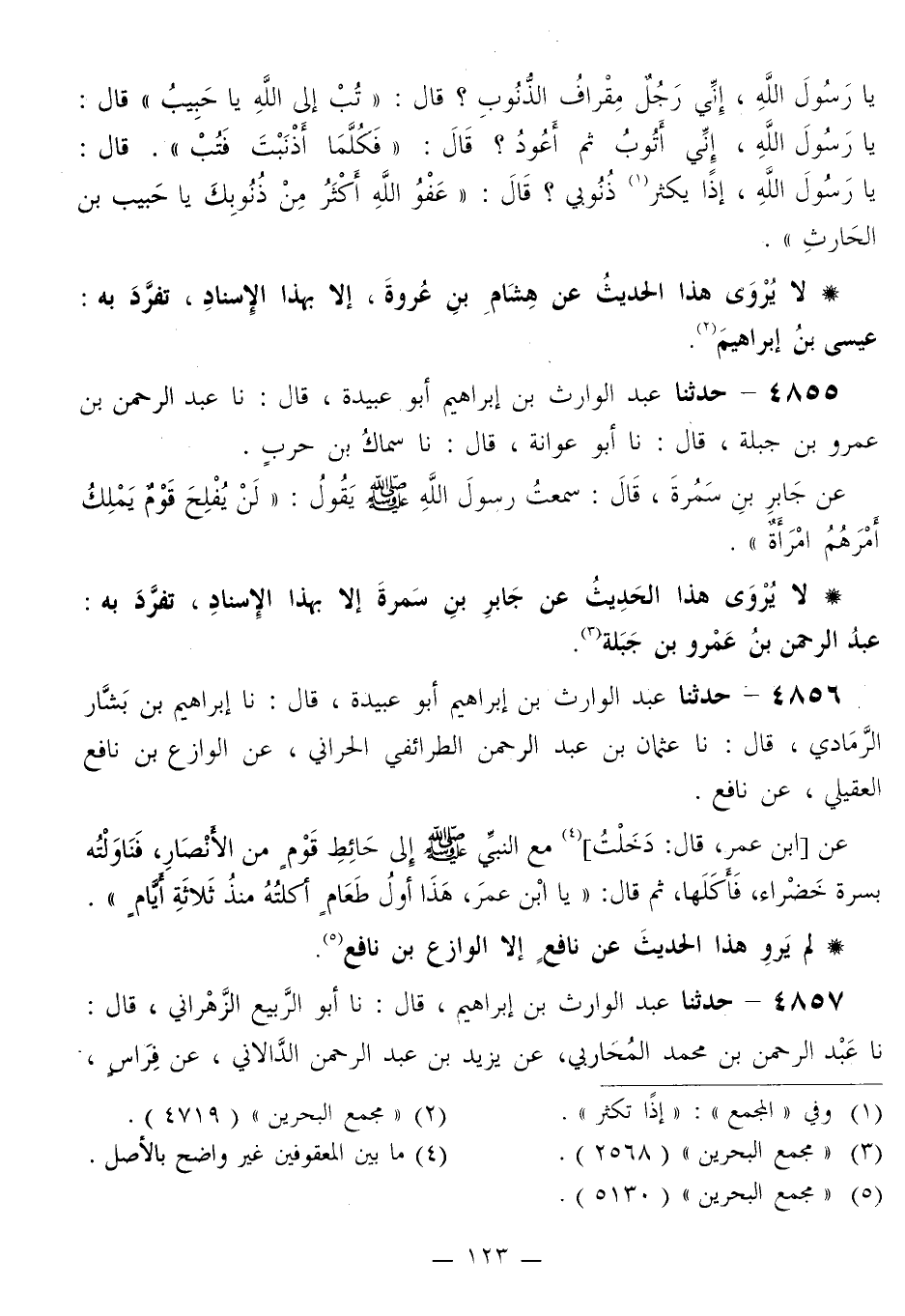 4855 - حَدَّثَنَا عَبْدُ الْوَارِثِ بْنُ إِبْرَاهِيمَ أَبُو عُبَيْدَةَ قَالَ: نَا عَبْدُ الرَّحْمَنِ بْنُ عَمْرِو بْنِ جَبَلَةَ قَالَ: نَا أَبُو عَوَانَةَ قَالَ: نَا سِمَاكُ بْنُ حَرْبٍ، عَنْ جَابِرِ بْنِ سَمُرَةَ قَالَ: سَمِعْتُ رَسُولَ اللَّهِ صَلَّى اللهُ عَلَيْهِ وَسَلَّمَ يَقُولُ: «§لَنْ يُفْلِحَ قَوْمٌ يَمْلِكُ أَمْرَهُمُ امْرَأَةٌ»