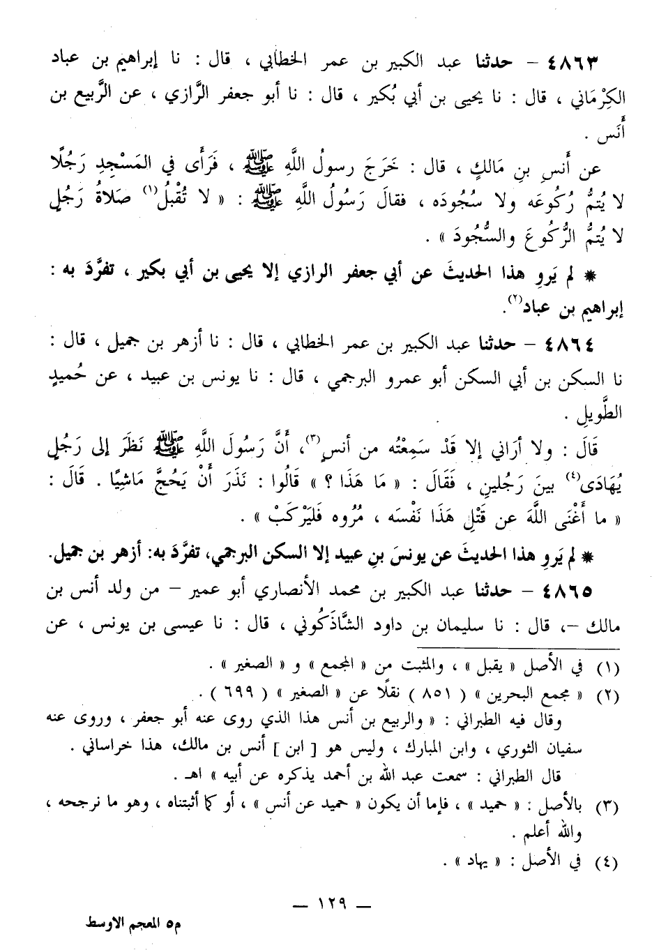 4863 - حَدَّثَنَا عَبْدُ الْكَبِيرِ بْنُ عُمَرَ الْخَطَّابِيُّ قَالَ: نَا إِبْرَاهِيمُ بْنُ عَبَّادٍ الْكِرْمَانِيُّ قَالَ: نَا يَحْيَى بْنُ أَبِي بُكَيْرٍ قَالَ: نَا أَبُو جَعْفَرٍ الرَّازِيُّ، عَنِ الرَّبِيعِ بْنِ أَنَسٍ، عَنْ أَنَسِ بْنِ مَالِكٍ قَالَ: خَرَجَ رَسُولُ اللَّهِ صَلَّى اللهُ عَلَيْهِ وَسَلَّمَ، فَرَأَى فِي الْمَسْجِدِ رَجُلًا لَا يُتِمُّ رُكُوعَهُ وَلَا سُجُودَهُ، فَقَالَ رَسُولُ اللَّهِ صَلَّى اللهُ عَلَيْهِ وَسَلَّمَ: «§لَا تُقْبَلُ صَلَاةُ رَجُلٍ لَا يُتِمُّ الرُّكُوعَ وَالسُّجُودَ»