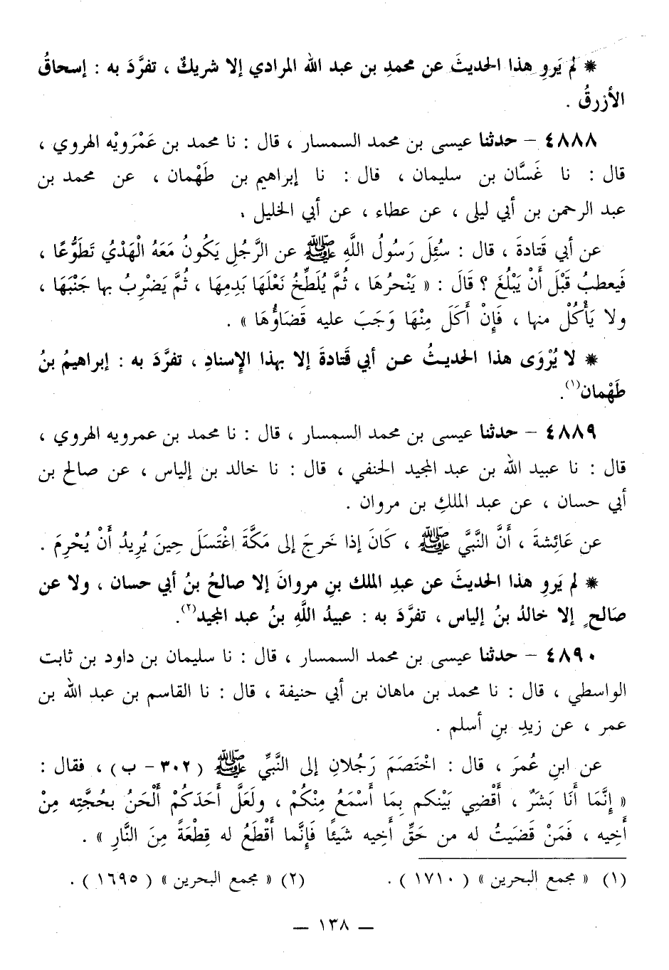 4890 - حَدَّثَنَا عِيسَى بْنُ مُحَمَّدٍ السِّمْسَارُ قَالَ: نَا سُلَيْمَانُ بْنُ دَاوُدَ بْنِ ثَابِتٍ الْوَاسِطِيُّ قَالَ: نَا مُحَمَّدُ بْنُ مَاهَانَ بْنِ أَبِي حَنِيفَةَ قَالَ: نَا الْقَاسِمُ بْنُ عَبْدِ اللَّهِ بْنِ عُمَرَ، عَنْ زَيْدِ بْنِ أَسْلَمَ، عَنِ ابْنِ عُمَرَ قَالَ: اخْتَصَمَ رَجُلَانِ إِلَى النَّبِيِّ صَلَّى اللهُ عَلَيْهِ وَسَلَّمَ، فَقَالَ: «§إِنَّمَا أَنَا بَشَرٌ، أَقْضِي بَيْنَكُمْ بِمَا أَسْمَعُ مِنْكُمْ، وَلَعَلَّ أَحَدَكُمْ أَلْحَنُ بِحُجَّتِهِ مِنْ أَخِيهِ، فَمَنْ قَضَيْتُ لَهُ مِنْ حَقِّ أَخِيهِ شَيْئًا فَإِنَّمَا أَقْطَعُ لَهُ قِطْعَةً مِنَ النَّارِ» -[139]- لَا يُرْوَى هَذَا الْحَدِيثُ عَنِ ابْنِ عُمَرَ إِلَّا بِهَذَا الْإِسْنَادِ، تَفَرَّدَ بِهِ: الْقَاسِمُ بْنُ عَبْدِ اللَّهِ بْنِ عُمَرَ "