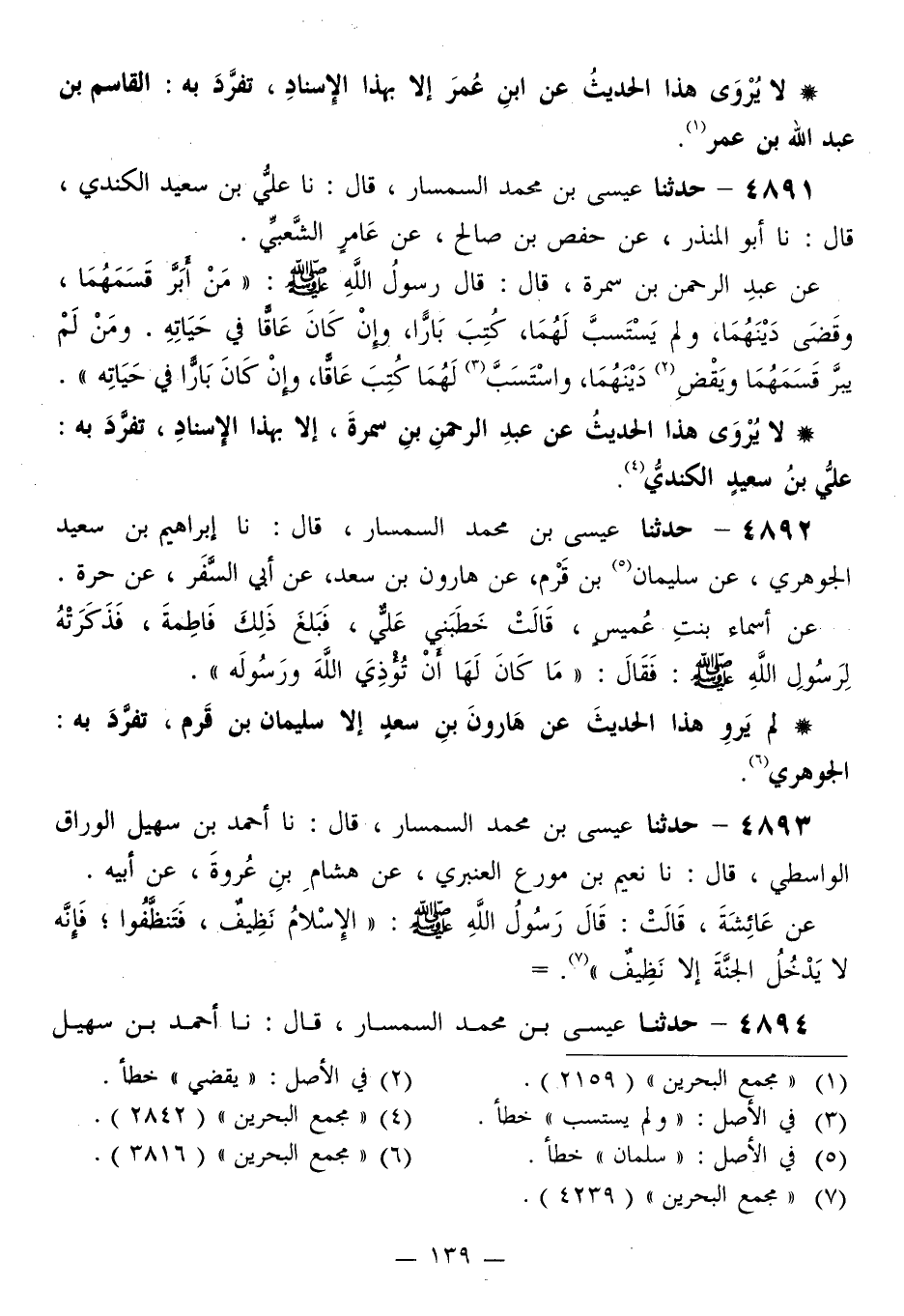 4891 - حَدَّثَنَا عِيسَى بْنُ مُحَمَّدٍ السِّمْسَارُ قَالَ: نَا عَلِيُّ بْنُ سَعِيدٍ الْكِنْدِيُّ قَالَ: نَا أَبُو الْمُنْذِرِ، عَنْ حَفْصِ بْنِ صَالِحٍ، عَنْ عَامِرٍ الشَّعْبِيِّ، عَنْ عَبْدِ الرَّحْمَنِ بْنِ سَمُرَةَ قَالَ: قَالَ رَسُولُ اللَّهِ صَلَّى اللهُ عَلَيْهِ وَسَلَّمَ: «§مَنْ أَبَّرَ قَسَمَهُمَا وَقَضَى دَيْنَهُمَا، وَلَمْ يَسْتَسِبَّ لَهُمَا، كُتِبَ بَارًّا، وَإِنْ كَانَ عَاقًّا فِي حَيَاتِهِ. وَمَنْ لَمْ يَبَرَّ قَسَمَهُمَا وَيَقْضِ دَيْنَهُمَا، وَاسْتَسَبَّ لَهُمَا كُتِبَ عَاقًّا، وَإِنْ كَانَ بَارًّا فِي حَيَاتِهِ»