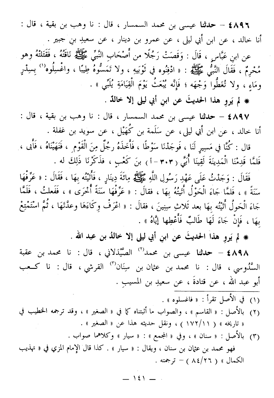 4896 - حَدَّثَنَا عِيسَى بْنُ مُحَمَّدٍ السِّمْسَارُ قَالَ: نَا وَهْبُ بْنُ بَقِيَّةَ قَالَ: أَنَا خَالِدٌ، عنِ ابْنِ أَبِي لَيْلَى، عَنْ عَمْرِو بْنِ دِينَارٍ، عَنْ سَعِيدِ بْنِ جُبَيْرٍ، عَنِ ابْنِ عَبَّاسٍ قَالَ: وَقَصَتْ رَجُلًا مِنْ أَصْحَابِ النَّبِيِّ صَلَّى اللهُ عَلَيْهِ وَسَلَّمَ نَاقَتُهُ، فَقَتَلَتْهُ وَهُوَ مُحْرِمٌ، فَقَالَ النَّبِيُّ صَلَّى اللهُ عَلَيْهِ وَسَلَّمَ: «§ادْفِنُوهُ فِي ثَوْبَيْهِ، وَلَا تُمِسُّوهُ طِيبًا، وَاغْسِلُوهُ بِسِدْرٍ وَمَاءٍ، وَلَا تُغَطُّوا وَجْهَهُ، فَإِنَّهُ يُبْعَثُ يَوْمَ الْقِيَامَةِ يُلَبِّي»