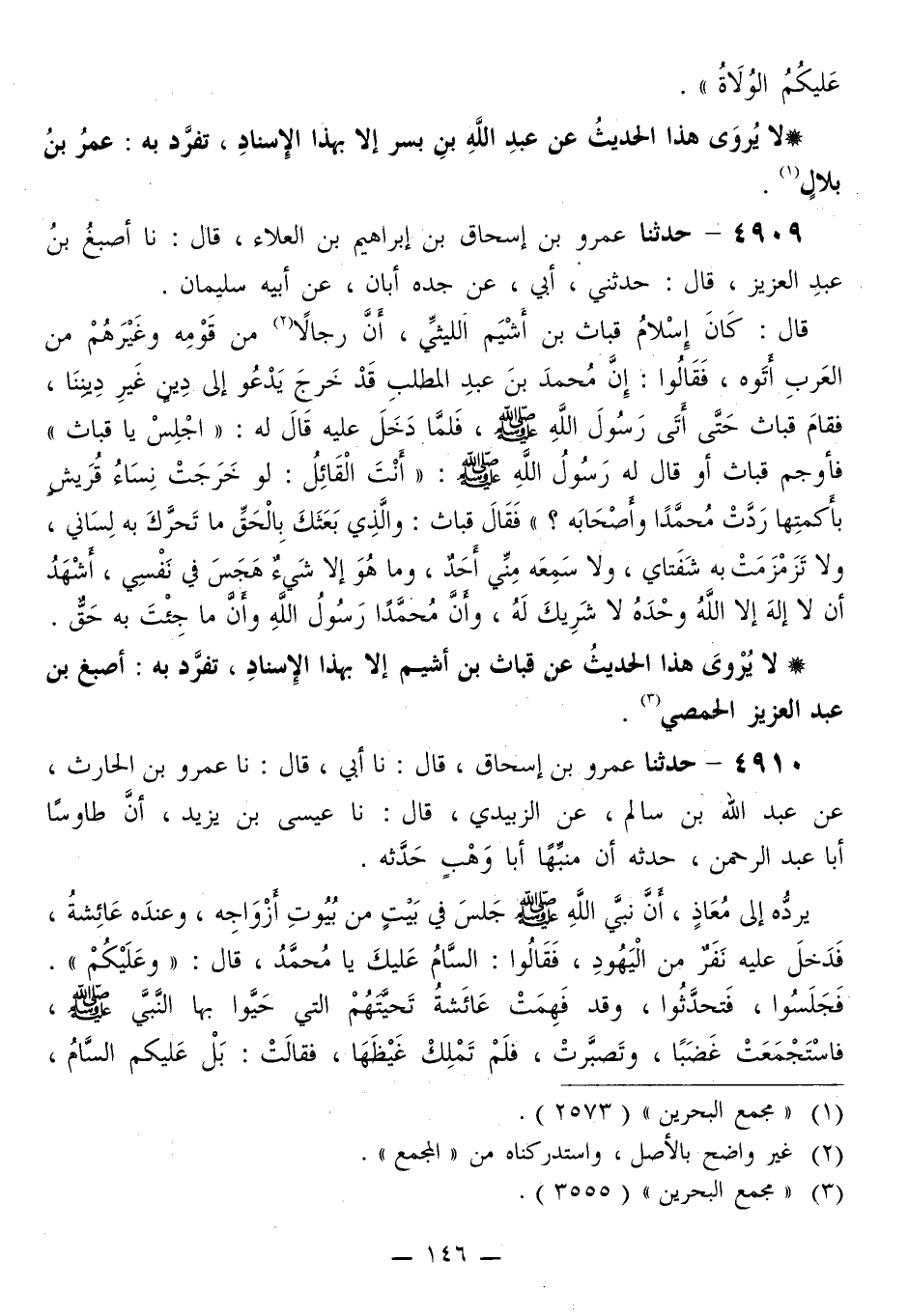 4910 - حَدَّثَنَا عَمْرُو بْنُ إِسْحَاقَ قَالَ: نَا أَبِي قَالَ: نَا عَمْرُو بْنُ الْحَارِثِ، عَنْ عَبْدِ اللَّهِ بْنِ سَالِمٍ، عَنِ الزُّبَيْدِيِّ قَالَ: نَا عِيسَى بْنُ يَزِيدَ، أَنَّ طَاوُسًا أَبَا عَبْدِ الرَّحْمَنِ حَدَّثَهُ، أَنَّ مُنَبِّهًا أَبَا وَهْبٍ حَدَّثَهُ يَرُدُّهُ إِلَى مُعَاذٍ، أَنَّ نَبِيَّ اللَّهِ صَلَّى اللهُ عَلَيْهِ وَسَلَّمَ جَلَسَ فِي بَيْتٍ مِنْ بُيُوتِ أَزْوَاجِهِ، وَعِنْدَهُ عَائِشَةُ، فَدَخَلَ عَلَيْهِ نَفَرٌ مِنَ الْيَهُودِ، فَقَالُوا: السَّامُ عَلَيْكَ يَا مُحَمَّدُ. قَالَ: «وَعَلَيْكُمْ» . فَجَلَسُوا فَتَحَدَّثُوا، وَقَدْ فَهِمَتْ عَائِشَةُ تَحِيَّتَهُمُ الَّتِي حَيَّوْا بِهَا النَّبِيَّ صَلَّى اللهُ عَلَيْهِ وَسَلَّمَ، فَاسْتَجْمَعَتْ غَضَبًا وَتَصَبَّرَتْ، فَلَمْ تَمْلِكُ غَيْظَهَا، فَقَالَتْ: بَلْ عَلَيْكُمُ السَّامُ -[147]- وَغَضَبُ اللَّهِ وَلَعْنَتُهُ، بِهَذَا تُحَيُّونَ نَبِيَّ اللَّهِ صَلَّى اللهُ عَلَيْهِ وَسَلَّمَ؟ ثُمَّ خَرَجُوا، فَقَالَ لَهَا النَّبِيُّ صَلَّى اللهُ عَلَيْهِ وَسَلَّمَ: «مَا حَمَلَكَ عَلَى مَا قُلْتِ؟» قَالَتْ: أَوْ لَمْ تَسْمَعْ كَيْفَ حَيَّوْكَ يَا رَسُولَ اللَّهِ؟ وَاللَّهِ مَا مَلَكَتُ نَفْسِي حِينَ سَمِعْتُ تَحِيَّتَهُمْ إِيَّاكَ، فَقَالَ لَهَا النَّبِيُّ صَلَّى اللهُ عَلَيْهِ وَسَلَّمَ: «لَا جَرَمَ، كَيْفَ رَأَيْتِ رَدَدْتُ عَلَيْهِمْ إِنَّ §الْيَهُودَ قَوْمٌ سَئِمُوا دِينَهُمْ، وَهُمْ قَوْمٌ حُسَّدٌ، وَلَمْ يَحْسِدُوا الْمُسْلِمِينَ عَلَى أَفْضَلَ مِنْ ثَلَاثٍ: رَدِّ السَّلَامِ، وَإِقَامَةِ الصُّفُوفِ، وَقَوْلِهِمْ خَلْفَ إِمَامِهِمْ فِي الْمَكْتُوبَةِ: آمِينَ»