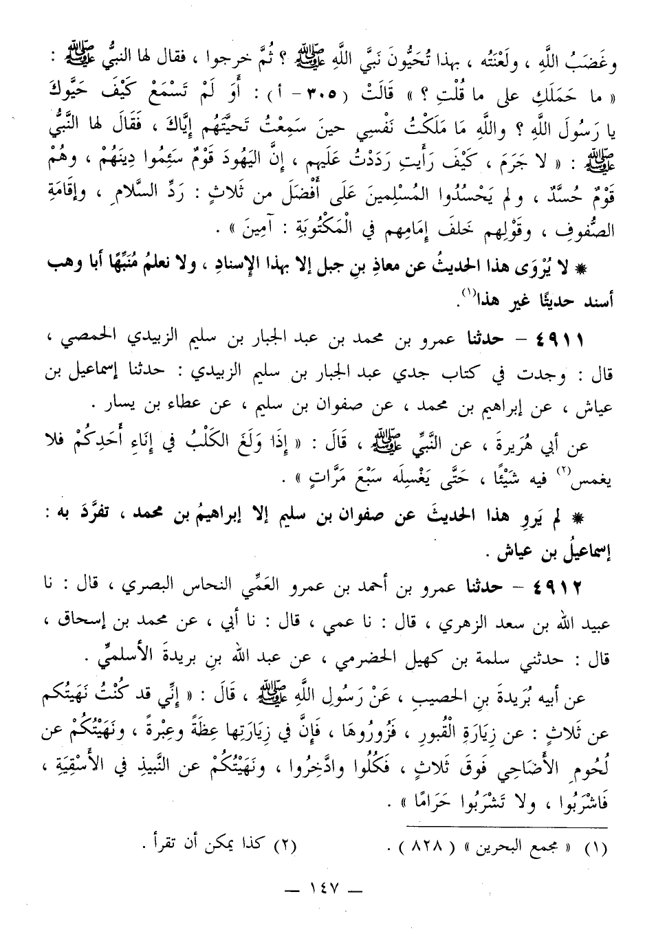 4912 - حَدَّثَنَا عَمْرُو بْنُ أَحْمَدَ الْعَمِّيُّ النُّحَاسُ الْمِصْرِيُّ قَالَ: نَا عُبَيْدُ اللَّهِ بْنُ سَعْدٍ الزُّهْرِيُّ قَالَ: نَا عَمِّي قَالَ: نَا أَبِي، عَنْ مُحَمَّدِ بْنِ إِسْحَاقَ قَالَ: حَدَّثَنِي سَلَمَةُ بْنُ كُهَيْلٍ الْحَضْرَمِيُّ، عَنْ عَبْدِ اللَّهِ بْنِ بُرَيْدَةَ الْأَسْلَمِيِّ، عَنْ أَبِيهِ بُرَيْدَةَ بْنِ الْحُصَيْبِ، عَنْ رَسُولِ اللَّهِ صَلَّى اللهُ عَلَيْهِ وَسَلَّمَ قَالَ: «§إِنِّي قَدْ كُنْتُ نَهَيْتُكُمْ عَنْ ثَلَاثٍ: عَنْ زِيَارَةِ الْقُبُورِ، فَزُورُوهَا، فَإِنَّ زِيَارَتَهَا عِظَةٌ وَعِبْرَةً، وَنَهَيْتُكُمْ عَنْ لُحُومِ الْأَضَاحِيِّ فَوْقَ ثَلَاثٍ فَكُلُوا وَادَّخِرُوا، وَنَهَيْتُكُمْ عَنِ النَّبِيذِ فِي الْأَسْقِيَةِ فَاشْرَبُوا، وَلَا تَشْرَبُوا حَرَامًا» -[148]- لَمْ يَرْوِ هَذَا الْحَدِيثَ عَنْ سَلَمَةَ بْنِ كُهَيْلٍ إِلَّا مُحَمَّدُ بْنُ إِسْحَاقَ، تَفَرَّدَ بِهِ: يَعْقُوبُ بْنُ إِبْرَاهِيمَ بْنِ سَعْدٍ، عَنْ أَبِيهِ "