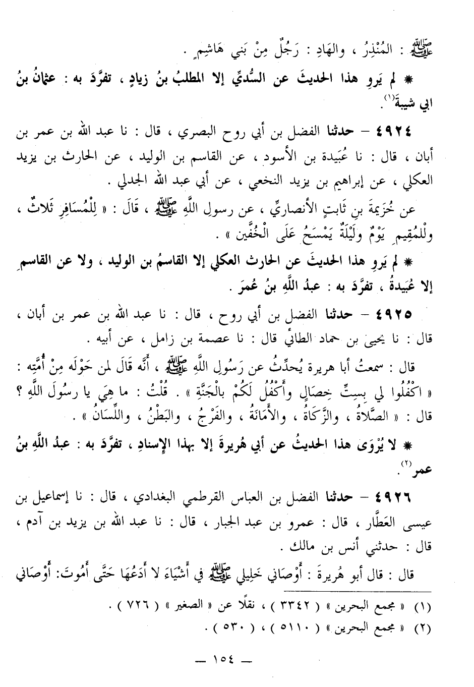 4924 - حَدَّثَنَا الْفَضْلُ بْنُ أَبِي رَوْحٍ الْبَصْرِيُّ قَالَ: نَا عَبْدُ اللَّهِ بْنُ عُمَرَ بْنِ أَبَانَ قَالَ: نَا عُبَيْدَةُ بْنُ الْأَسْوَدِ، عَنِ الْقَاسِمِ بْنِ الْوَلِيدِ، عَنِ الْحَارِثِ بْنِ يَزِيدَ الْعُكْلِيِّ، عَنْ إِبْرَاهِيمَ بْنِ يَزِيدَ النَّخَعِيِّ، عَنْ أَبِي عَبْدِ اللَّهِ الْجَدَلِيِّ، عَنْ خُزَيْمَةَ بْنِ ثَابِتٍ الْأَنْصَارِيِّ، عَنْ رَسُولِ اللَّهِ صَلَّى اللهُ عَلَيْهِ وَسَلَّمَ قَالَ: «§لِلْمُسَافِرِ ثَلَاثٌ، وَلِلْمُقِيمِ يَوْمٌ وَلَيْلَةٌ وَيَمْسَحُ عَلَى الْخُفَّيْنِ»