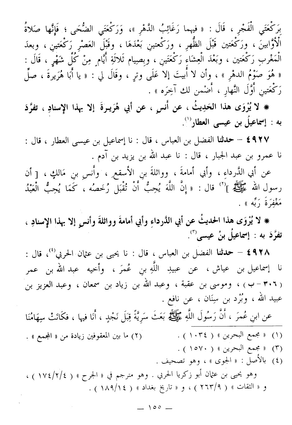 4927 - حَدَّثَنَا الْفَضْلُ بْنُ الْعَبَّاسِ قَالَ: نَا إِسْمَاعِيلُ بْنُ عِيسَى الْعَطَّارُ قَالَ: نَا عَمْرُو بْنُ عَبْدِ الْجَبَّارِ قَالَ: نَا عَبْدُ اللَّهِ بْنُ يَزِيدَ بْنِ آدَمَ، عَنْ أَبِي الدَّرْدَاءِ، وَأَبِي أُمَامَةَ، وَوَاثِلَةَ بْنِ الْأَسْقَعِ، وَأَنَسِ بْنِ مَالِكٍ، أَنَّ رَسُولَ اللَّهِ صَلَّى اللهُ عَلَيْهِ وَسَلَّمَ قَالَ: «إِنَّ §اللَّهَ يُحِبُّ أَنْ تُقْبَلَ رُخَصُهُ، كَمَا يُحِبُّ الْعَبْدُ مَغْفِرَةَ رَبِّهِ»