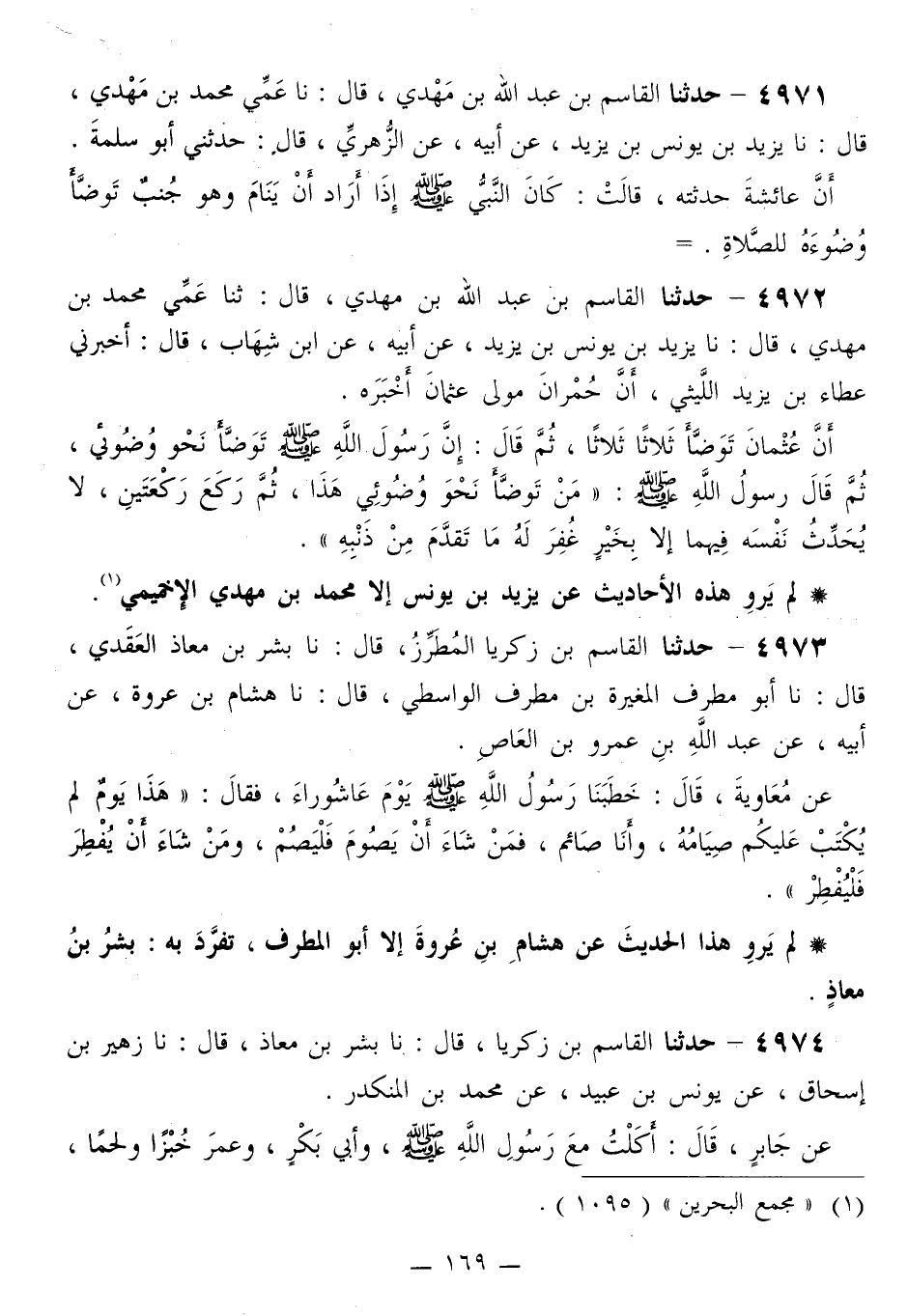 4972 - حَدَّثَنَا الْقَاسِمُ بْنُ عَبْدِ اللَّهِ بْنِ مَهْدِيٍّ قَالَ: ثَنَا عَمِّي مُحَمَّدُ بْنُ مَهْدِيٍّ قَالَ: نَا يَزِيدُ بْنُ يُونُسَ بْنِ يَزِيدَ، عَنْ أَبِيهِ، عَنِ ابْنِ شِهَابٍ قَالَ: أَخْبَرَنِي عَطَاءُ بْنُ يَزِيدَ اللَّيْثِيُّ، أَنَّ حُمْرَانَ مَوْلَى عُثْمَانَ أَخْبَرَهُ، أَنَّ عُثْمَانَ «تَوَضَّأَ ثَلَاثًا ثَلَاثًا، ثُمَّ قَالَ: إِنَّ رَسُولَ اللَّهِ صَلَّى اللهُ عَلَيْهِ وَسَلَّمَ تَوَضَّأَ نَحْوَ وُضُوئِي» ، ثُمَّ قَالَ رَسُولُ اللَّهِ صَلَّى اللهُ عَلَيْهِ وَسَلَّمَ: «§مَنْ تَوَضَّأَ نَحْوَ وُضُوئِي هَذَا، ثُمَّ رَكَعَ رَكْعَتَيْنِ، لَا يُحَدِّثُ نَفْسَهُ فِيهِمَا إِلَّا بِخَيْرٍ غُفِرَ لَهُ مَا تَقَدَّمَ مِنْ ذَنْبِهِ»