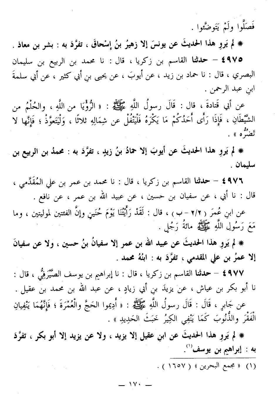 4976 - حَدَّثَنَا الْقَاسِمُ بْنُ زَكَرِيَّا قَالَ: نَا مُحَمَّدُ بْنُ عُمَرَ بْنِ عَلِيٍّ الْمُقَدَّمِيُّ قَالَ: نَا أَبِي، عَنْ سُفْيَانَ بْنِ حُسَيْنٍ، عَنْ عُبَيْدِ اللَّهِ بْنِ عُمَرَ، عَنْ نَافِعٍ، عَنِ ابْنِ عُمَرَ قَالَ: «§لَقَدْ رَأَيْتُنَا يَوْمَ حُنَيْنٍ وَإِنَّ الْفِئَتَيْنِ لَمُوَلِّيَتَيْنِ، وَمَا مَعَ رَسُولِ اللَّهِ صَلَّى اللهُ عَلَيْهِ وَسَلَّمَ مِائَةُ رَجُلٍ»