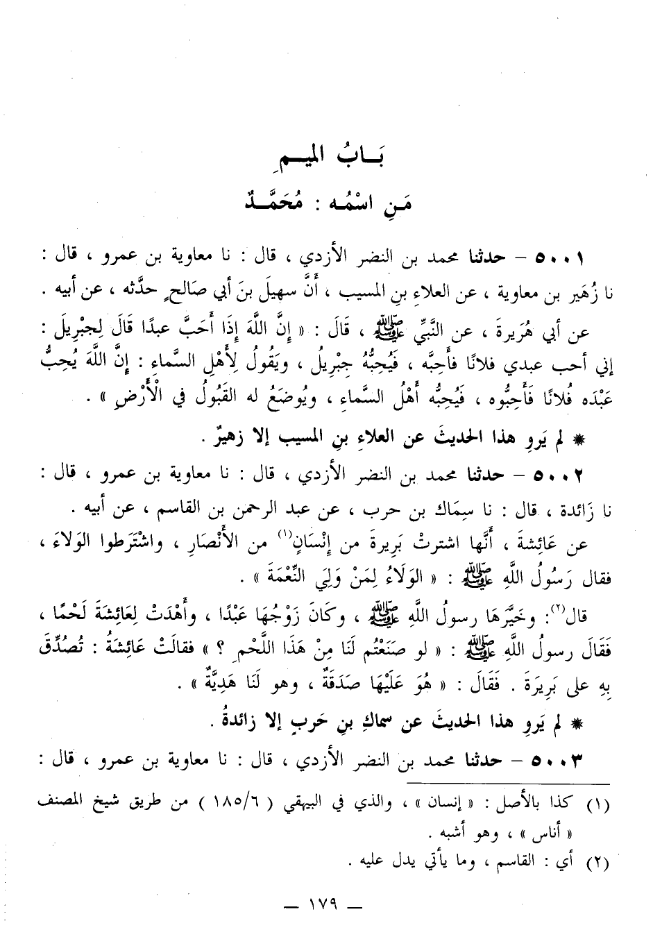 5001 - حَدَّثَنَا مُحَمَّدُ بْنُ النَّضْرِ الْأَزْدِيُّ قَالَ: نَا مُعَاوِيَةُ بْنُ عَمْرٍو قَالَ: نَا زُهَيْرُ بْنُ مُعَاوِيَةَ، عَنِ الْعَلَاءِ بْنِ الْمُسَيِّبِ، أَنَّ سُهَيْلَ بْنَ أَبِي صَالِحٍ، حَدَّثَهُ، عَنْ أَبِيهِ، عَنْ أَبِي هُرَيْرَةَ، عَنِ النَّبِيِّ صَلَّى اللهُ عَلَيْهِ وَسَلَّمَ قَالَ: «§إِنَّ اللَّهَ إِذَا أَحَبَّ عَبْدًا قَالَ لِجِبْرِيلَ: إِنِّي أُحِبُّ عَبْدِي فُلَانًا فَأَحِبَّهُ، فَيُحِبُّهُ جِبْرِيلُ، وَيَقُولُ لِأَهْلِ السَّمَاءِ: إِنَّ اللَّهَ يُحِبُّ عَبْدَهُ فُلَانًا فَأَحِبُّوهُ، فَيُحِبُّهُ أَهْلُ السَّمَاءِ، وَيُوضَعُ لَهُ الْقَبُولُ فِي الْأَرْضِ»