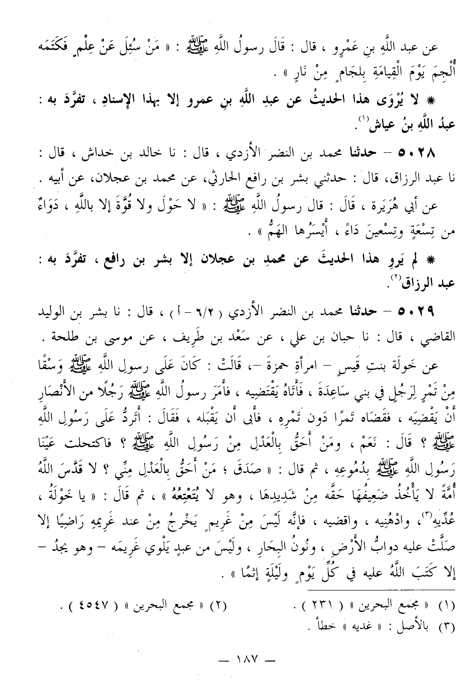 5029 - حَدَّثَنَا مُحَمَّدُ بْنُ النَّضْرِ الْأَزْدِيُّ قَالَ: نَا بِشْرُ بْنُ الْوَلِيدِ الْقَاضِي قَالَ: نَا حِبَّانُ بْنُ عَلِيٍّ، عَنْ سَعْدِ بْنِ طَرِيفٍ، عَنْ مُوسَى بْنِ طَلْحَةَ، عَنْ خَوْلَةَ بِنْتِ قَيْسٍ، امْرَأَةِ حَمْزَةَ، قَالَتْ: كَانَ عَلَى رَسُولِ اللَّهِ صَلَّى اللهُ عَلَيْهِ وَسَلَّمَ وَسْقًا مِنْ تَمْرٍ لِرَجُلٍ فِي بَنِي سَاعِدَةَ، فَأَتَاهُ يَقْتَضِيهِ، فَأَمَرَ رَسُولُ اللَّهِ صَلَّى اللهُ عَلَيْهِ وَسَلَّمَ رَجُلًا مِنَ الْأَنْصَارِ أَنْ يَقْضِيَهُ، فَقَضَاهُ تَمْرًا دُونَ تَمْرِهِ، فَأَبَى أَنْ يَقْبَلَهُ، فَقَالَ: أَتَرُدُّ عَلَى رَسُولِ اللَّهِ صَلَّى اللهُ عَلَيْهِ وَسَلَّمَ؟ قَالَ: نَعَمْ، وَمَنْ أَحَقُّ بِالْعَدْلِ مِنْ رَسُولِ اللَّهِ صَلَّى اللهُ عَلَيْهِ وَسَلَّمَ؟ فَاكْتَحَلَتْ عَيْنَا رَسُولِ اللَّهِ صَلَّى اللهُ عَلَيْهِ وَسَلَّمَ بِدُمُوعِهِ، ثُمَّ قَالَ: «§صَدَقَ، مَنْ أَحَقُّ بِالْعَدْلِ مِنِّي؟ لَا قَدَّسَ اللَّهُ أُمَّةً لَا يَأْخُذُ ضَعِيفُهَا حَقَّهُ مِنْ شَدِيدِهَا، وَهُوَ لَا يُتَعْتِعُهُ» ، ثُمَّ قَالَ: «يَا خَوْلَةُ، عُدِّيهِ، وَادْهُنِيهِ، وَاقْضِيهِ، فَإِنَّهُ لَيْسَ مِنْ غَرِيمٍ يَخْرُجُ مِنْ عِنْدِ غَرِيمِهِ رَاضِيًا إِلَّا صَلَّتْ عَلَيْهِ دَوَابُّ الْأَرْضِ، وَنُونُ الْبِحَارِ، وَلَيْسَ مِنْ عَبْدٍ يَلْوِي غَرِيمَهُ، وَهُوَ يَجِدُ إِلَّا كَتَبَ اللَّهُ عَلَيْهِ فِي كُلِّ يَوْمٍ وَلَيْلَةٍ إِثْمًا» -[188]- لَا يُرْوَى هَذَا الْحَدِيثُ عَنْ خَوْلَةَ إِلَّا بِهَذَا الْإِسْنَادِ، تَفَرَّدَ بِهِ: حِبَّانُ بْنُ عَلِيٍّ "