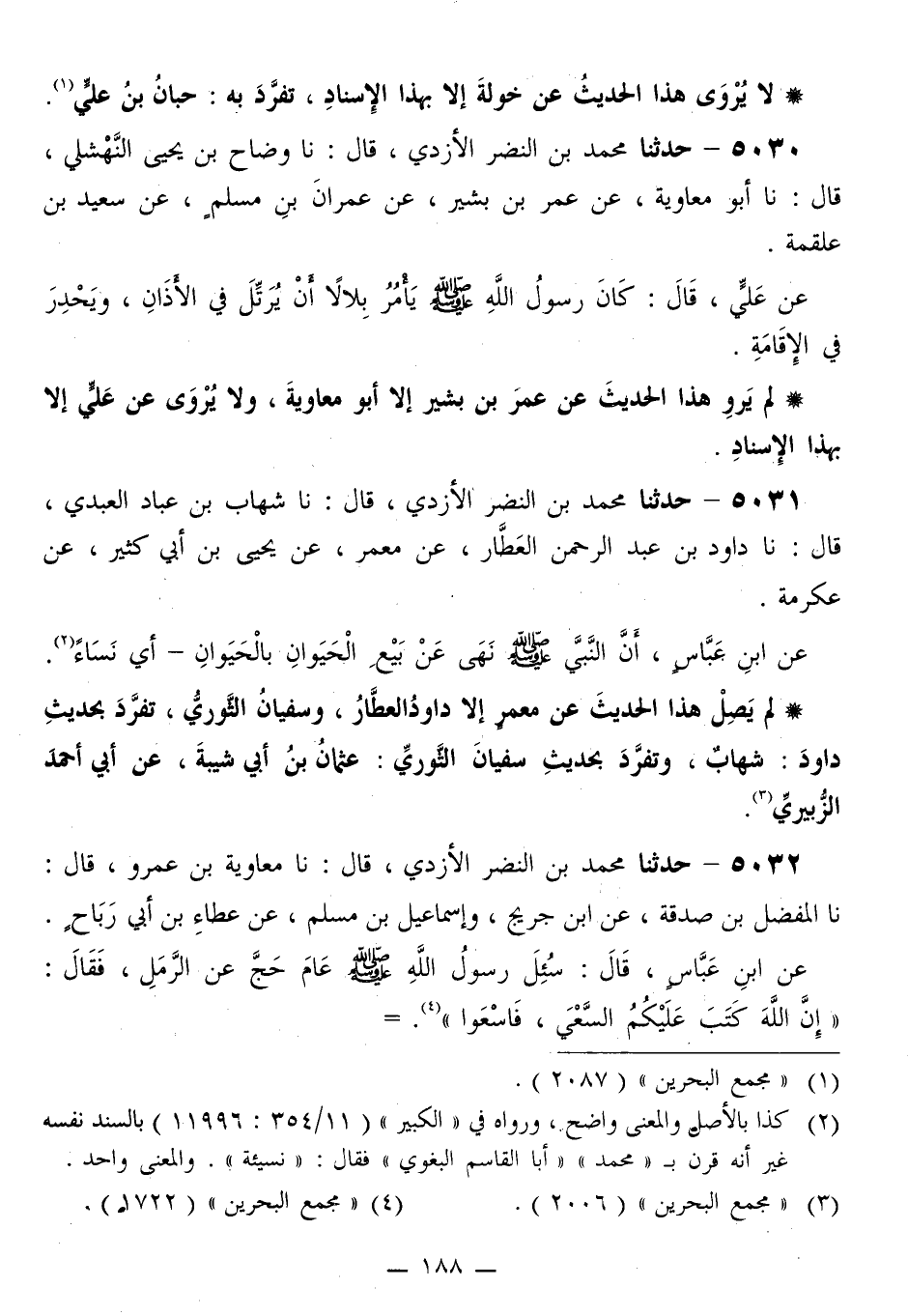 5032 - حَدَّثَنَا مُحَمَّدُ بْنُ النَّضْرِ الْأَزْدِيُّ قَالَ: نَا مُعَاوِيَةُ بْنُ عَمْرٍو قَالَ: نَا الْمُفَضَّلُ بْنُ صَدَقَةَ، عَنِ ابْنِ جُرَيْجٍ، وَإِسْمَاعِيلَ بْنِ مُسْلِمٍ، عَنْ عَطَاءِ بْنِ أَبِي رَبَاحٍ، عَنِ ابْنِ عَبَّاسٍ قَالَ: سُئِلَ رَسُولُ اللَّهِ صَلَّى اللهُ عَلَيْهِ وَسَلَّمَ عَامَ حَجَّ عَنِ §الرَّمَلِ فَقَالَ: «إِنَّ اللَّهَ كَتَبَ عَلَيْكُمُ السَّعْيَ فَاسْعَوْا»