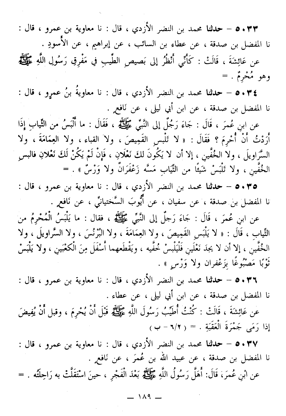 5035 - حَدَّثَنَا مُحَمَّدُ بْنُ النَّضْرِ الْأَزْدِيُّ قَالَ: نَا مُعَاوِيَةُ بْنُ عَمْرٍو قَالَ: نَا الْمُفَضَّلُ بْنُ صَدَقَةَ، عَنْ سُفْيَانَ، عَنْ أَيُّوبَ السَّخْتِيَانِيِّ، عَنْ نَافِعٍ، عَنِ ابْنِ عُمَرَ قَالَ: جَاءَ رَجُلٌ إِلَى النَّبِيِّ صَلَّى اللهُ عَلَيْهِ وَسَلَّمَ، فَقَالَ: §مَا يَلْبَسُ الْمُحْرِمُ مِنَ الثِّيَابِ؟ قَالَ: «لَا يَلْبَسُ الْقَمِيصَ، وَلَا الْعِمَامَةَ، وَلَا الْبُرْنُسَ، وَلَا السَّرَاوِيلَ، وَلَا الْخُفَّيْنِ، إِلَّا أَنْ لَا يَجِدَ نَعْلَيْنِ فَلْيَلْبَسْ خُفَّيْهِ، وَيَقْطَعْهُمَا أَسْفَلَ مِنَ الْكَعْبَيْنِ، وَلَا يَلْبَسُ ثَوْبًا مَصْبُوغًا بِزَعْفَرَانٍ وَلَا وَرْسٍ»