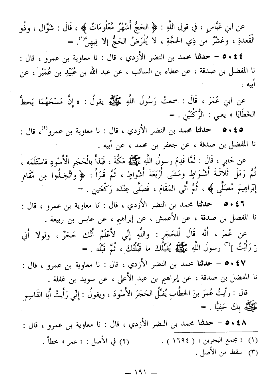 5046 - حَدَّثَنَا مُحَمَّدُ بْنُ النَّضْرِ الْأَزْدِيُّ قَالَ: نَا مُعَاوِيَةُ بْنُ عَمْرٍو قَالَ: نَا الْمُفَضَّلُ بْنُ صَدَقَةَ، عَنِ الْأَعْمَشِ، عَنْ إِبْرَاهِيمَ، عَنْ عَابِسِ بْنِ رَبِيعَةَ، عَنْ عُمَرَ، أَنَّهُ قَالَ لِلْحَجَرِ: «وَاللَّهِ، إِنِّي لَأَعْلَمُ أَنَّكَ حَجَرٌ، وَلَوْلَا أَنِّي §رَأَيْتُ رَسُولَ اللَّهِ صَلَّى اللهُ عَلَيْهِ وَسَلَّمَ يُقَبِّلُكَ مَا قَبَّلْتُكَ» ، ثُمَّ قَبَّلَهُ