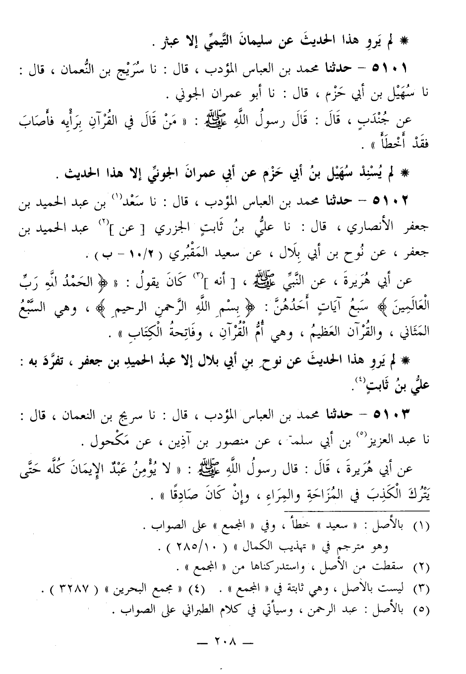 5101 - حَدَّثَنَا مُحَمَّدُ بْنُ الْعَبَّاسِ الْمُؤَدِّبُ قَالَ: نَا سُرَيْجُ بْنُ النُّعْمَانِ قَالَ: نَا سُهَيْلُ بْنُ أَبِي حَزْمٍ قَالَ: نَا أَبُو عِمْرَانَ الْجَوْنِيُّ، عَنْ جُنْدُبٍ قَالَ: قَالَ رَسُولُ اللَّهِ صَلَّى اللهُ عَلَيْهِ وَسَلَّمَ: «§مَنْ قَالَ فِي الْقُرْآنِ بِرَأْيِهِ فَأَصَابَ فَقَدْ أَخْطَأَ» لَمْ يُسْنِدْ سُهَيْلُ بْنُ أَبِي حَزْمٍ، عَنْ أَبِي عِمْرَانَ الْجَوْنِيِّ إِلَّا هَذَا الْحَدِيثَ "