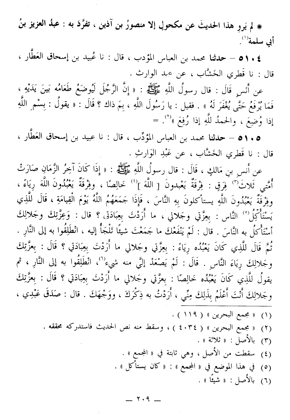 5105 - حَدَّثَنَا مُحَمَّدُ بْنُ الْعَبَّاسِ الْمُؤَدِّبُ قَالَ: نَا عُبَيْدُ بْنُ إِسْحَاقَ الْعَطَّارُ قَالَ: نَا قَطَرِيٍّ الْخَشَّابُ، عَنْ عَبْدِ الْوَارِثِ، عَنْ أَنَسِ بْنِ مَالِكٍ قَالَ: قَالَ رَسُولُ اللَّهِ صَلَّى اللهُ عَلَيْهِ وَسَلَّمَ: «إِذَا كَانَ آخَرُ الزَّمَانِ صَارَتْ أُمَّتِي ثَلَاثَ فِرَقٍ: فِرْقَةٌ يَعْبُدُونَ اللَّهَ خَالِصًا، وَفِرْقَةٌ يَعْبُدُونَ اللَّهَ رِيَاءً، وَفِرْقَةٌ يَعْبُدُونَ اللَّهَ يَسْتَأْكِلُونَ بِهِ النَّاسَ، فَإِذَا جَمَعَهُمُ اللَّهُ يَوْمَ الْقِيَامَةِ، قَالَ لِلَّذِي يَسْتَأْكِلُ النَّاسَ: §بِعِزَّتِي وَجَلَالِي، وَمَا أَرَدْتَ بِعِبَادَتِي؟ قَالَ: وَعِزَّتِكَ وَجَلَالِكَ أَسْتَأْكِلُ بِهِ النَّاسَ. قَالَ: لَمْ يَنْفَعْكَ مَا جَمَعْتَ شَيْئًا تَلْجَأُ إِلَيْهِ، انْطَلِقُوا بِهِ إِلَى النَّارِ، ثُمَّ قَالَ لِلَّذِي كَانَ يَعْبُدُهُ رِيَاءً: بِعِزَّتِي وَجَلَالِي مَا أَرَدْتَ بِعِبَادَتِي؟ قَالَ: بِعِزَّتِكَ وَجَلَالِكَ رِيَاءَ النَّاسِ. قَالَ: لَمْ يَصْعَدْ إِلَيَّ مِنْهُ شَيْءٌ، انْطَلِقُوا بِهِ إِلَى النَّارِ، ثُمَّ يَقُولُ لِلَّذِي كَانَ يَعْبُدُهُ خَالِصًا: بِعِزَّتِي وَجَلَالِي مَا أَرَدْتَ بِعِبَادَتِي؟ قَالَ: بِعِزَّتِكَ وَجَلَالِكَ أَنْتَ أَعْلَمُ بِذَلِكَ مِنِّي أَرَدْتُ بِهِ ذِكْرَكَ وَوَجْهَكَ. قَالَ: صَدَقَ عَبْدِي، -[210]- انْطَلِقُوا بِهِ إِلَى الْجَنَّةِ»