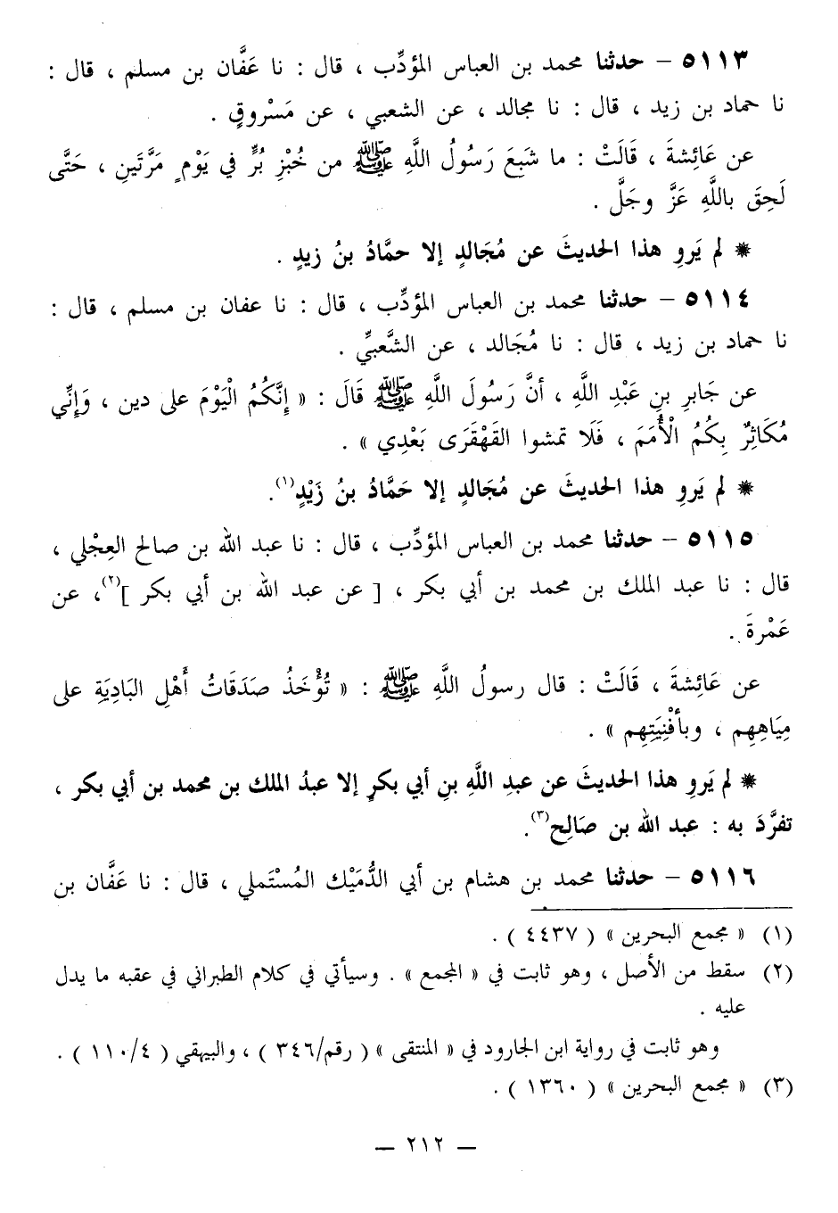 5114 - حَدَّثَنَا مُحَمَّدُ بْنُ الْعَبَّاسِ الْمُؤَدِّبُ قَالَ: نَا عَفَّانُ بْنُ مُسْلِمٍ قَالَ: نَا حَمَّادُ بْنُ زَيْدٍ قَالَ: نَا مُجَالِدٌ، عَنِ الشَّعْبِيِّ، عَنْ جَابِرِ بْنِ عَبْدِ اللَّهِ، أَنَّ رَسُولَ اللَّهِ صَلَّى اللهُ عَلَيْهِ وَسَلَّمَ قَالَ: «§إِنَّكُمُ الْيَوْمَ عَلَى دِينٍ، وَإِنِّي مُكَاثِرٌ بِكُمُ الْأُمَمَ، فَلَا تَمْشُوا الْقَهْقَرَى بَعْدِي»