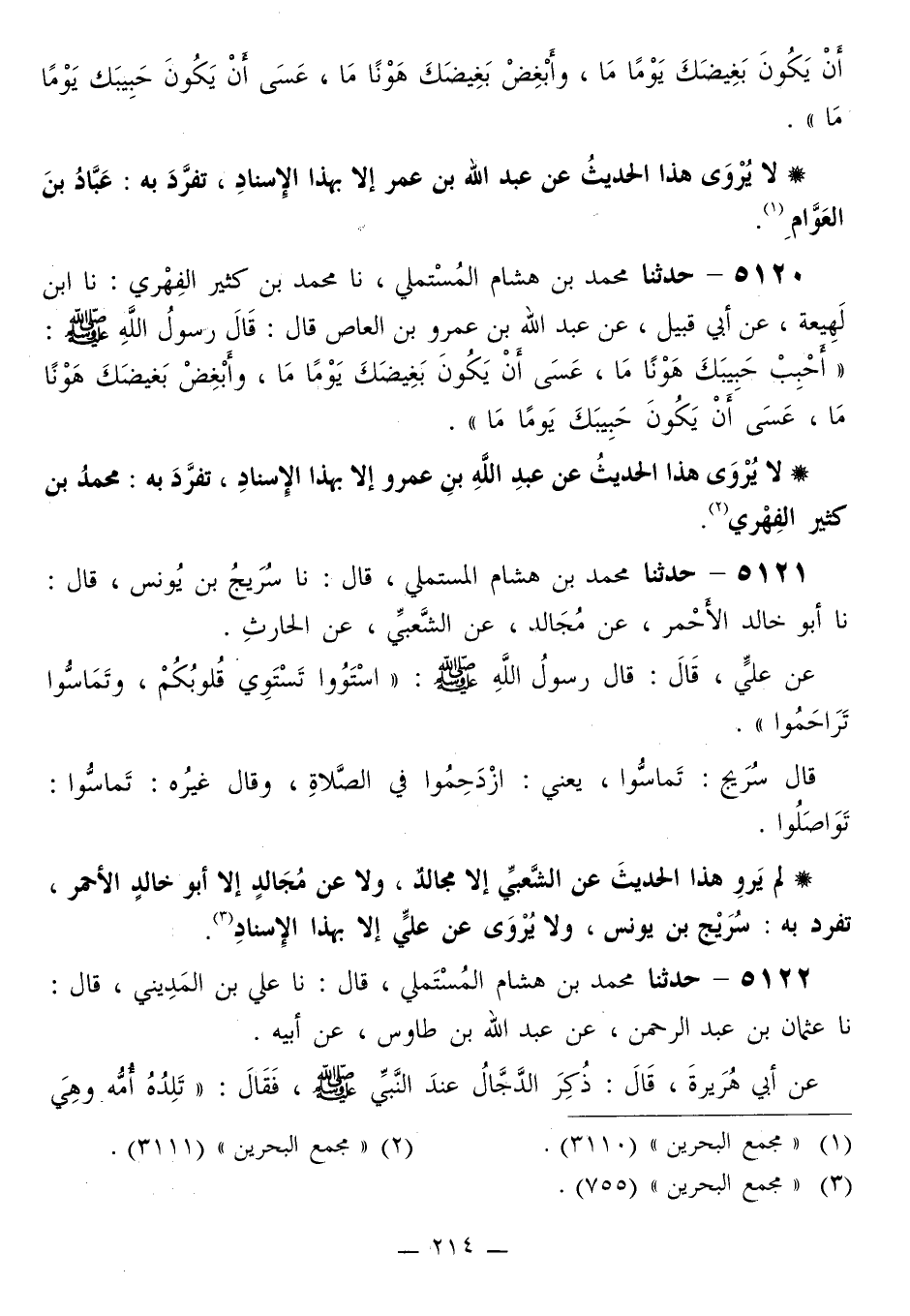 5120 - حَدَّثَنَا مُحَمَّدُ بْنُ هِشَامٍ الْمُسْتَمْلِيُّ، نَا مُحَمَّدُ بْنُ كَثِيرٍ الْفِهْرِيُّ،: نَا ابْنُ لَهِيعَةَ، عَنْ أَبِي قَبِيلٍ، عَنْ عَبْدِ اللَّهِ بْنِ عَمْرِو بْنِ الْعَاصِ قَالَ: قَالَ رَسُولُ اللَّهِ صَلَّى اللهُ عَلَيْهِ وَسَلَّمَ: «§أَحْبِبْ حَبِيبَكَ هَوْنًا مَا عَسَى أَنْ يَكُونَ بَغِيضَكَ يَوْمًا مَا، وَأَبْغِضْ بَغِيضَكَ هَوْنًا، مَاعَسَى أَنْ يَكُونَ حَبِيبَكَ يَوْمًا مَا»