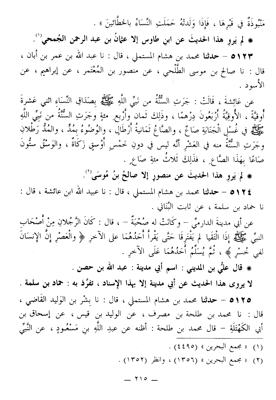 5123 - حَدَّثَنَا مُحَمَّدُ بْنُ هِشَامٍ الْمُسْتَمْلِيُّ قَالَ: نَا عَبْدُ اللَّهِ بْنُ عُمَرَ بْنِ أَبَانَ قَالَ: نَا صَالِحُ بْنُ مُوسَى الطَّلْحِيُّ، عَنْ مَنْصُورِ بْنِ الْمُعْتَمِرِ، عَنْ إِبْرَاهِيمَ، عَنِ الْأَسْوَدِ، عَنْ عَائِشَةَ، قَالَتْ: «§جَرَتِ السَّنَةُ مِنْ نَبِيِّ اللَّهِ صَلَّى اللهُ عَلَيْهِ وَسَلَّمَ بِصَدَاقِ النِّسَاءِ اثْنَتَى عَشْرَةَ أُوقِيَّةً، وَالْأُوقِيَّةُ أَرْبَعُونَ دِرْهَمًا، وَذَلِكَ ثَمَانُونَ وَأَرْبَعُ مِئَةٍ، وَجَرَتِ السَّنَةُ مِنْ نَبِيِّ اللَّهِ صَلَّى اللهُ عَلَيْهِ وَسَلَّمَ فِي غُسْلِ الْجَنَابَةِ صَاعٌ، وَالصَّاعُ ثَمَانِيَةُ أَرْطَالٍ، وَالْوُضُوءُ بِمُدٍّ، وَالْمُدُّ رِطْلَانِ، وَجَرَتِ السَّنَةُ مِنْهُ فِي الْعُشْرِ أَنَّهُ لَيْسَ فِي دُونِ خَمْسِ أَوْسُقٍ زَكَاةٌ، وَالْوَسْقُ سِتُّونَ صَاعًا بِهَذَا الصَّاعِ، فَذَلِكَ ثَلَاثُ مِئَةِ صَاعٍ»