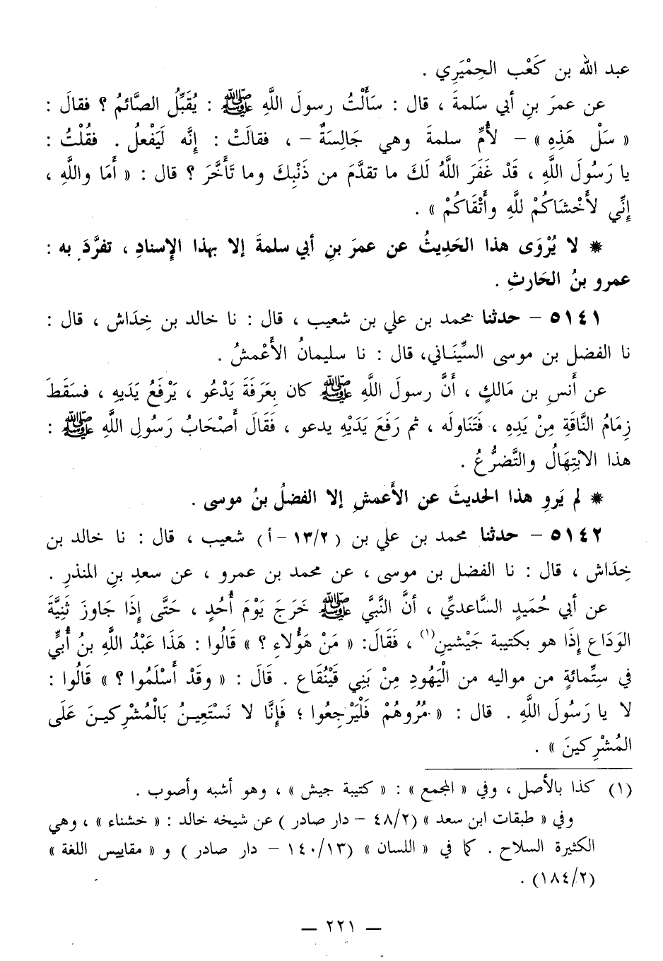 5142 - حَدَّثَنَا مُحَمَّدُ بْنُ عَلِيِّ بْنِ شُعَيْبٍ قَالَ: نَا خَالِدُ بْنُ خِدَاشٍ قَالَ: نَا الْفَضْلُ بْنُ مُوسَى، عَنْ مُحَمَّدِ بْنِ عَمْرٍو، عَنْ سَعْدِ بْنِ الْمُنْذِرِ، عَنْ أَبِي حُمَيْدٍ السَّاعِدِيِّ، أَنَّ النَّبِيَّ صَلَّى اللهُ عَلَيْهِ وَسَلَّمَ خَرَجَ يَوْمَ أُحُدٍ حَتَّى إِذَا جَاوَزَ ثَنِيَّةَ الْوَدَاعِ إِذَا هُوَ بِكَتِيبَةِ جَيْشِنٍ، فَقَالَ: «مَنْ هَؤُلَاءِ؟» قَالُوا: هَذَا عَبْدُ اللَّهِ بْنُ أُبَيٍّ فِي سِتِّمِائَةٍ مِنْ مَوَالِيهِ مِنَ الْيَهُودِ مِنْ بَنِي قَيْنُقَاعٍ قَالَ: «وَقَدْ أَسْلَمُوا؟» قَالُوا: لَا، يَا رَسُولَ اللَّهِ. قَالَ: «§مُرُوهُمْ فَلْيَرْجِعُوا، فَإِنَّا لَا نَسْتَعِينُ بِالْمُشْرِكِينَ عَلَى الْمُشْرِكِينَ» -[222]- لَمْ يُجَوِّدْ هَذَا الْحَدِيثَ عَنْ مُحَمَّدِ بْنِ عَمْرٍو إِلَّا الْفَضْلُ بْنُ مُوسَى، وَعَبَّادُ بْنُ عَبَّادٍ الْمُهَلَّبِيُّ "
