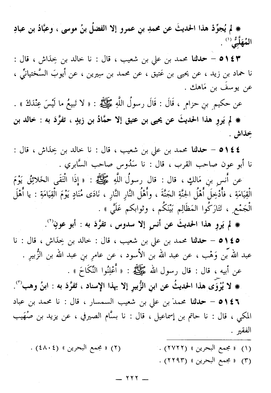 5144 - حَدَّثَنَا مُحَمَّدُ بْنُ عَلِيِّ بْنِ شُعَيْبٍ قَالَ: نَا خَالِدُ بْنُ خِدَاشٍ قَالَ: نَا أَبُو عَوْنٍ، صَاحِبُ الْقِرَبِ قَالَ: نَا سَدُوسٌ، صَاحِبُ السَّابِرِيِّ، عَنْ أَنَسِ بْنِ مَالِكٍ قَالَ: قَالَ رَسُولُ اللَّهِ صَلَّى اللهُ عَلَيْهِ وَسَلَّمَ: «§إِذَا الْتَقَى الْخَلَائِقُ يَوْمَ الْقِيَامَةِ، فَأُدْخِلَ أَهْلُ الْجَنَّةِ الْجَنَّةَ، وَأَهْلُ النَّارِ النَّارَ نَادَى مُنَادٍ يَوْمَ الْقِيَامَةِ: يَا أَهْلَ الْجَمْعِ، تَتَارَكُوا الْمَظَالِمَ بَيْنَكُمْ وَثَوَابُكُمْ عَلَيَّ»