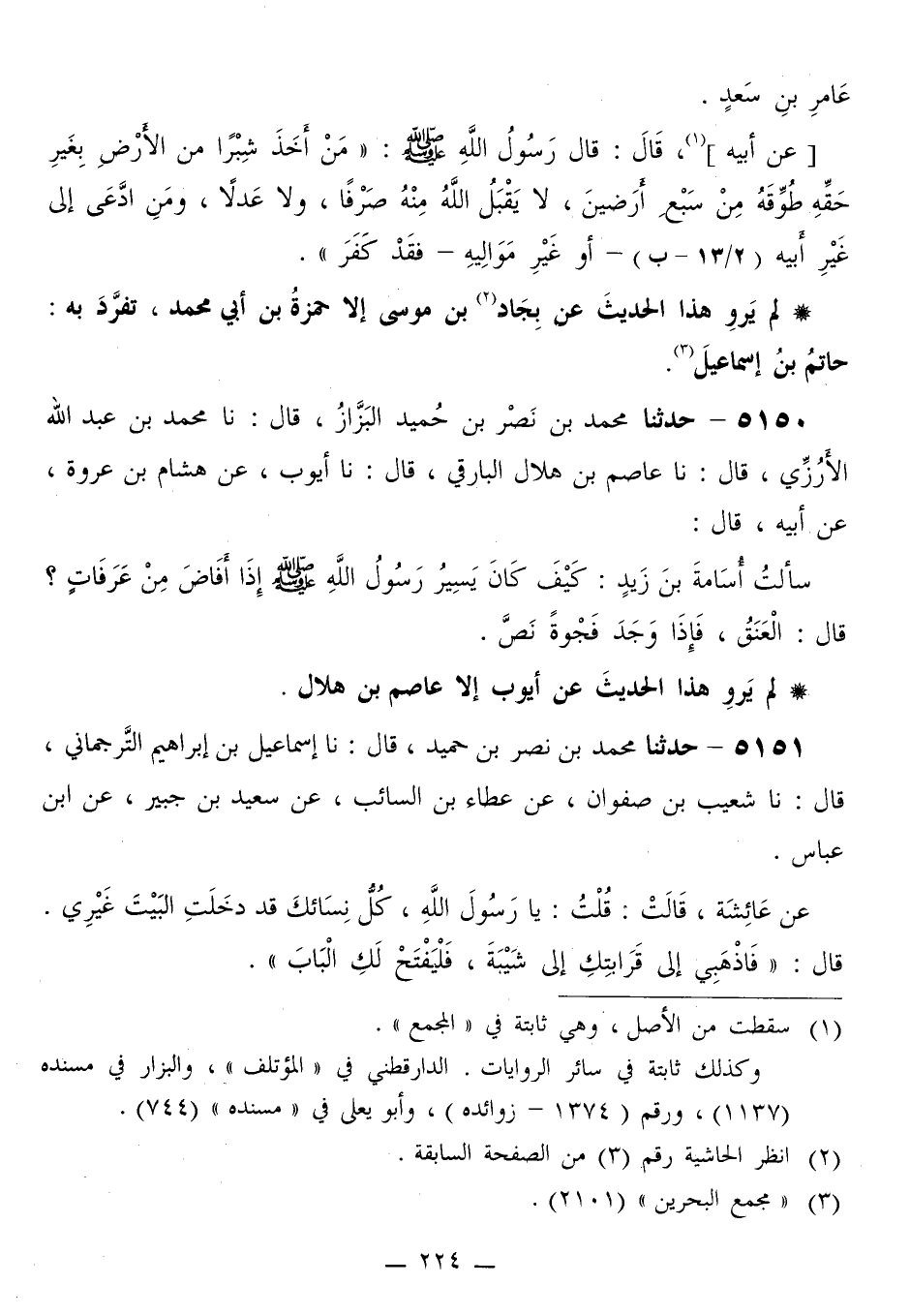 5150 - حَدَّثَنَا مُحَمَّدُ بْنُ نَصْرِ بْنِ حُمَيْدٍ الْبَزَّازُ قَالَ: نَا مُحَمَّدُ بْنُ عَبْدِ اللَّهِ الْأَرُزِّيُّ قَالَ: نَا عَاصِمُ بْنُ هِلَالٍ الْبَارِقِيُّ قَالَ: نَا أَيُّوبُ، عَنْ هِشَامِ بْنِ عُرْوَةَ، عَنْ أَبِيهِ قَالَ: سَأَلْتُ أُسَامَةَ بْنَ زَيْدٍ: §كَيْفَ كَانَ يَسِيرُ رَسُولُ اللَّهِ صَلَّى اللهُ عَلَيْهِ وَسَلَّمَ إِذَا أَفَاضَ مِنْ عَرَفَاتٍ؟ قَالَ: «الْعَنَقَ، فَإِذَا وَجَدَ فَجْوَةً نَصَّ»