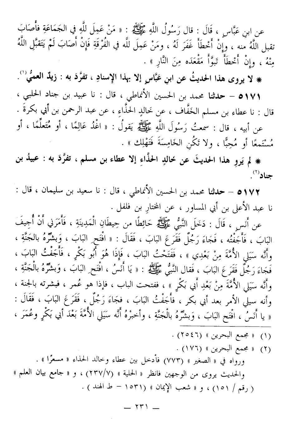 5171 - حَدَّثَنَا مُحَمَّدُ بْنُ الْحُسَيْنِ الْأَنْمَاطِيُّ قَالَ: نَا عُبَيْدُ بْنُ جَنَّادٍ الْحَلَبِيُّ قَالَ: نَا عَطَاءُ بْنُ مُسْلِمٍ الْخَفَّافُ، عَنْ خَالِدٍ الْحَذَّاءِ، عَنْ عَبْدِ الرَّحْمَنِ بْنِ أَبِي بَكْرَةَ، عَنْ أَبِيهِ قَالَ: سَمِعْتُ رَسُولَ اللَّهِ صَلَّى اللهُ عَلَيْهِ وَسَلَّمَ يَقُولُ: «§اغْدُ عَالِمًا، أَوْ مُتَعَلِّمًا، أَوْ مُسْتَمِعًا، أَوْ مُحِبًّا، وَلَا تَكُنِ الْخَامِسَةَ فَتَهْلِكَ»