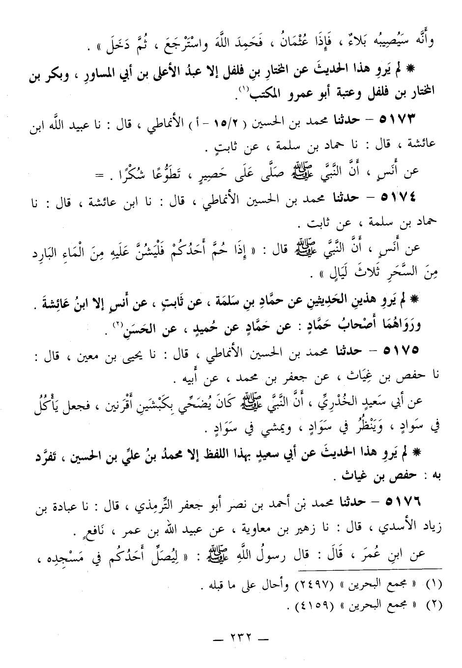 5173 - حَدَّثَنَا مُحَمَّدُ بْنُ الْحُسَيْنِ الْأَنْمَاطِيُّ قَالَ: نَا عُبَيْدُ ابْنُ عَائِشَةَ قَالَ: نَا حَمَّادُ بْنُ سَلَمَةَ، عَنْ ثَابِتٍ، عَنْ أَنَسٍ، «أَنَّ النَّبِيَّ صَلَّى اللهُ عَلَيْهِ وَسَلَّمَ §صَلَّى عَلَى حَصِيرٍ تَطَوُّعًا شُكْرًا»