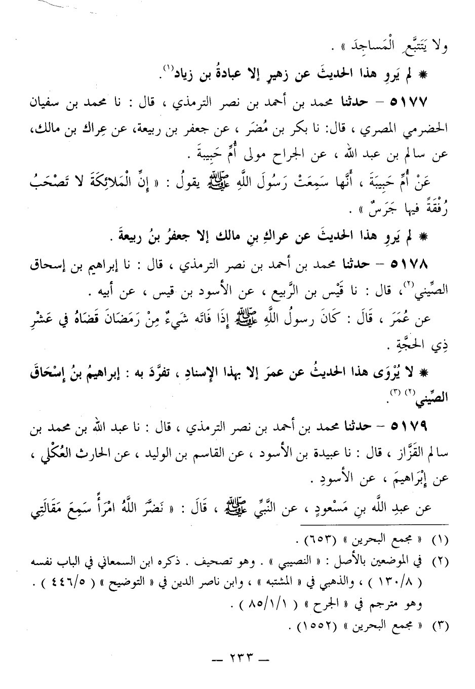 5179 - حَدَّثَنَا مُحَمَّدُ بْنُ أَحْمَدَ بْنِ نَصْرٍ التِّرْمِذِيُّ قَالَ: نَا عَبْدُ اللَّهِ بْنُ مُحَمَّدِ بْنِ سَالِمٍ الْقَزَّازُ قَالَ: نَا عُبَيْدَةُ بْنُ الْأَسْوَدِ، عَنِ الْقَاسِمِ بْنِ الْوَلِيدِ، عَنِ الْحَارِثِ الْعُكْلِيِّ، عَنْ إِبْرَاهِيمَ، عَنِ الْأَسْوَدِ، عَنْ عَبْدِ اللَّهِ بْنِ مَسْعُودٍ، عَنِ النَّبِيِّ صَلَّى اللهُ عَلَيْهِ وَسَلَّمَ قَالَ: «§نَضَرَّ اللَّهُ امْرَأً سَمِعَ مَقَالَتِي -[234]- فَحَفِظَهَا، فَإِنَّهُ رُبَّ حَامِلِ فِقْهٍ غَيْرِ فَقِيهٍ، وَرُبَّ حَامِلِ فِقْهٍ إِلَى مَنْ هُوَ أَفْقَهُ مِنْهُ، ثَلَاثٌ لَا يُغِلُّ عَلَيْهِنَّ قَلْبُ رَجُلٍ مُسْلِمٍ: إِخْلَاصُ الْعَمَلِ لِلَّهِ، وَالنَّصِيحَةُ لِوُلَاةِ الْأَمْرِ، وَلُزُومُ جَمَاعَةِ الْمُسْلِمِينَ، فَإِنَّ دَعْوَتَهُمْ تُحِيطُ مَنْ وَرَائِهِمْ»