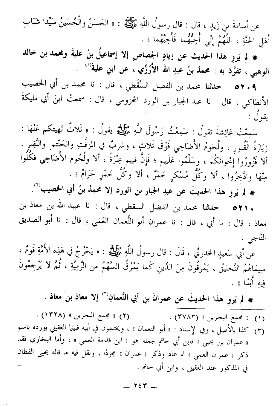 5210 - حَدَّثَنَا مُحَمَّدُ بْنُ الْفَضْلِ السَّقَطِيُّ قَالَ: نَا عُبَيْدُ اللَّهِ بْنُ مُعَاذِ بْنِ مُعَاذٍ قَالَ: نَا أَبِي قَالَ: نَا عِمْرَانُ أَبُو النُّعْمَانِ الْعَمِّيُّ قَالَ: نَا أَبُو الصِّدِّيقِ النَّاجِيُّ، عَنْ أَبِي سَعِيدٍ الْخُدْرِيِّ، قَالَ، قَالَ رَسُولُ اللَّهِ صَلَّى اللهُ عَلَيْهِ وَسَلَّمَ: «§يَخْرُجُ فِي هَذِهِ الْأُمَّةِ قَوْمٌ، سِيمَاهُمُ التَّحْلِيقُ، يَمْرُقُونَ مِنَ الدِّينِ كَمَا يَمْرُقُ السَّهْمُ مِنَ الرَّمِيَّةِ، ثُمَّ لَا يَرْجِعُونَ فِيهِ أَبَدًا»
