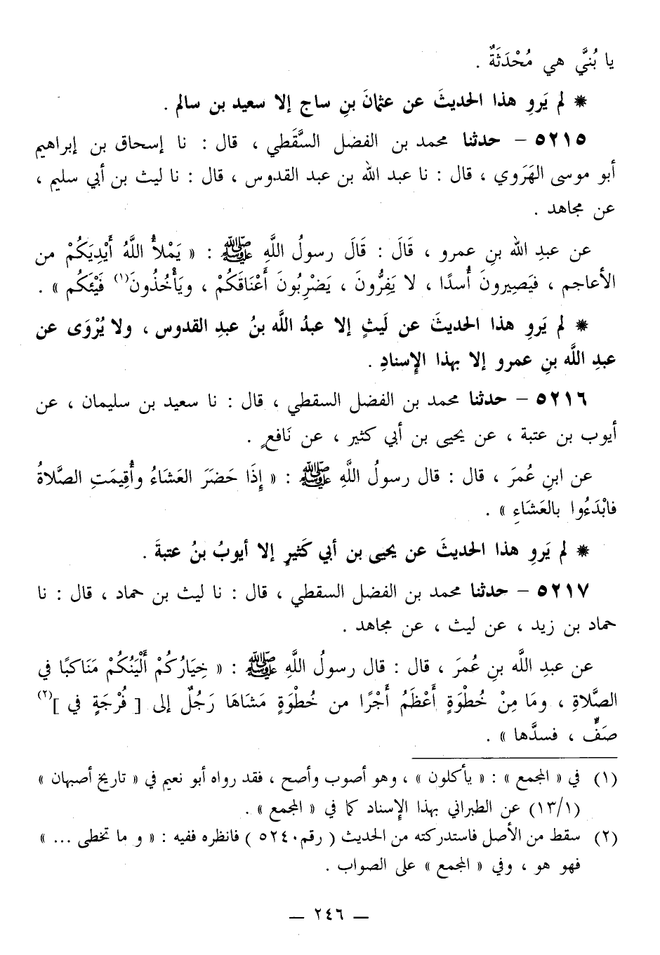 5217 - حَدَّثَنَا مُحَمَّدُ بْنُ الْفَضْلِ السَّقَطِيُّ قَالَ: نَا لَيْثُ بْنُ حَمَّادٍ قَالَ: نَا حَمَّادُ بْنُ زَيْدٍ، عَنْ لَيْثٍ، عَنْ مُجَاهِدٍ، عَنْ عَبْدِ اللَّهِ بْنِ عُمَرَ قَالَ: قَالَ رَسُولُ اللَّهِ صَلَّى اللهُ عَلَيْهِ وَسَلَّمَ: «§خِيَارُكُمْ أَلْيَنُكُمْ مَنَاكِبًا فِي الصَّلَاةِ، وَمَا مِنْ خُطْوَةٍ أَعْظَمُ أَجْرًا مِنْ خُطْوَةٍ مَشَاهَا رَجُلٌ إِلَى فُرْجَةٍ فِي صَفٍّ فَسَدَّهَا» -[247]- لَمْ يَرْوِ هَذَا الْحَدِيثَ عَنْ حَمَّادِ بْنِ زَيْدٍ إِلَّا لَيْثُ بْنُ حَمَّادٍ "