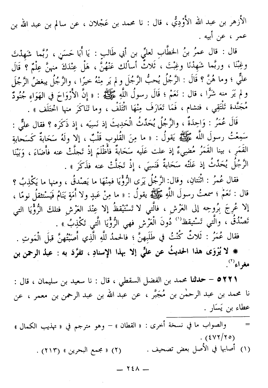 5221 - حَدَّثَنَا مُحَمَّدُ بْنُ الْفَضْلِ السَّقَطِيُّ قَالَ: نَا سَعِيدُ بْنُ سُلَيْمَانَ قَالَ: نَا مُحَمَّدُ بْنُ عَبْدِ الرَّحْمَنِ بْنِ مُجَبَّرٍ، عَنْ عَبْدِ اللَّهِ بْنِ عَبْدِ الرَّحْمَنِ بْنِ مَعْمَرٍ، عَنْ عَطَاءِ بْنِ يَسَارٍ، -[249]- عَنْ عَائِشَةَ، قَالَتْ: قَالَ رَسُولُ اللَّهِ صَلَّى اللهُ عَلَيْهِ وَسَلَّمَ: «§لَا يُرِيدُ اللَّهُ بِأَهْلِ بَيْتٍ رِفْقًا إِلَّا نَفَعَهُمْ، وَلَا يَحْرِمُهُمْ إِيَّاهُ إِلَّا ضَرَّهُمْ»