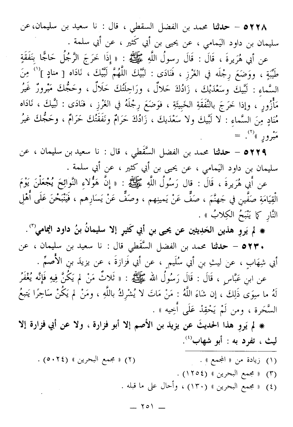 5228 - حَدَّثَنَا مُحَمَّدُ بْنُ الْفَضْلِ السَّقَطِيُّ قَالَ: نَا سَعِيدُ بْنُ سُلَيْمَانَ، عَنْ سُلَيْمَانَ بْنِ دَاوُدَ الْيَمَامِيُّ، عَنْ يَحْيَى بْنِ أَبِي كَثِيرٍ، عَنْ أَبِي سَلَمَةَ، عَنْ أَبِي هُرَيْرَةَ قَالَ: قَالَ رَسُولُ اللَّهِ صَلَّى اللهُ عَلَيْهِ وَسَلَّمَ: «§إِذَا خَرَجَ الرَّجُلُ حَاجًّا بِنَفَقَةٍ طَيِّبَةٍ، وَوَضَعَ رِجْلَهُ فِي الْغَرْزِ، فَنَادَى: لَبَّيْكَ اللَّهُمَّ لَبَّيْكَ، نَادَاهُ مُنَادٍ مِنَ السَّمَاءِ: لَبَّيْكَ وَسَعْدَيْكَ، زَادُكَ حَلَالٌ، وَرَاحِلَتُكَ حَلَالٌ، وَحَجُّكُ مَبْرُورٌ غَيْرُ مَأْزُورٍ، وَإِذَا خَرَجَ بِالنَّفَقَةِ الْخَبِيثَةِ، فَوَضَعَ رِجْلَهُ فِي الْغَرْزِ، فَنَادَى: لَبَّيْكَ، نَادَاهُ مُنَادٍ مِنَ السَّمَاءِ: لَا لَبَّيْكَ وَلَا سَعْدَيْكَ، زَادُكَ حَرَامٌ وَنَفَقَتُكَ حَرَامٌ، وَحَجُّكَ غَيْرُ مَبْرُورٍ»