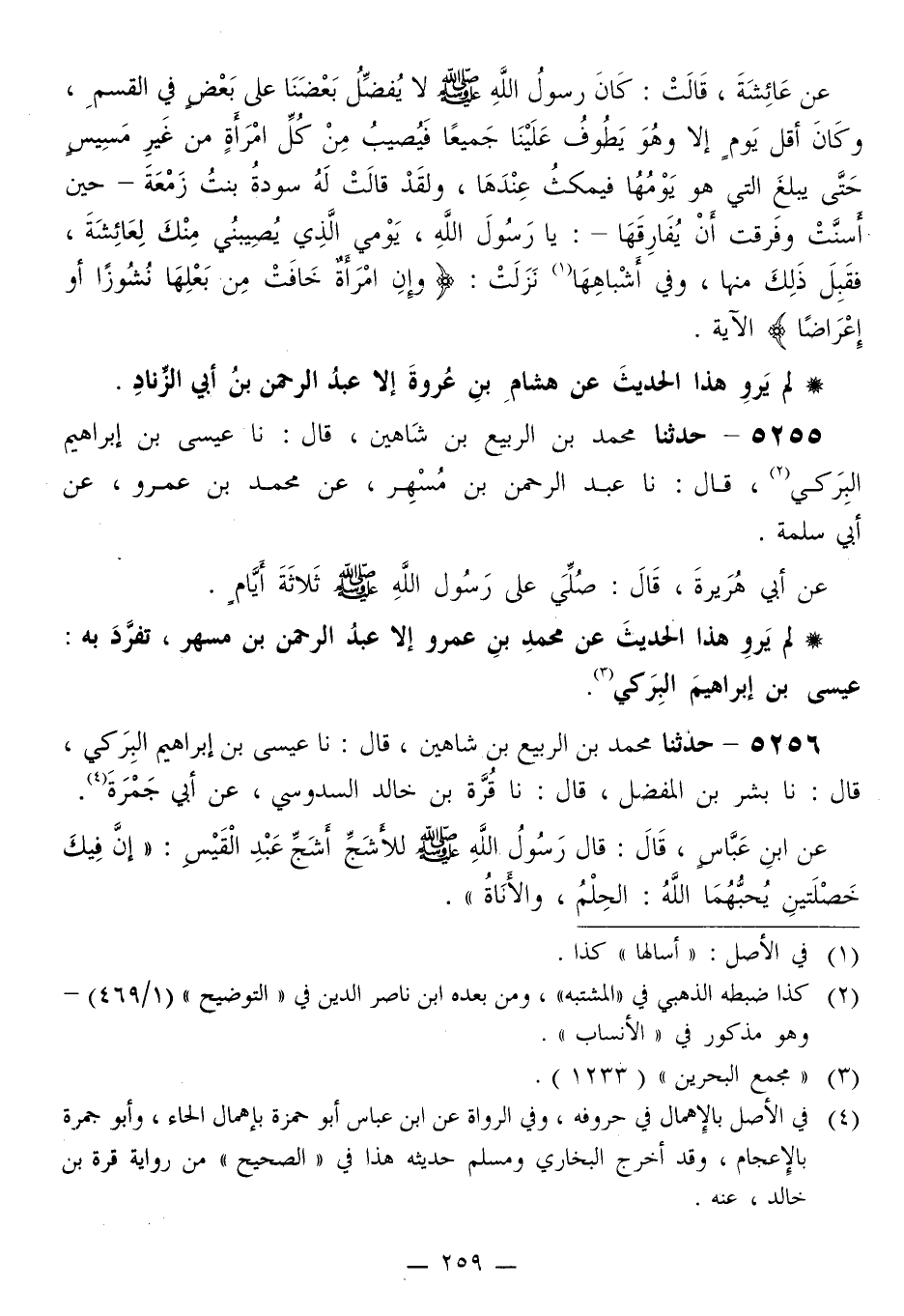 5256 - حَدَّثَنَا مُحَمَّدُ بْنُ الرَّبِيعِ بْنِ شَاهِينَ قَالَ: نَا عِيسَى بْنُ إِبْرَاهِيمَ الْبِرَكِيُّ قَالَ: نَا بِشْرُ بْنُ الْمُفَضَّلِ قَالَ: نَا قُرَّةُ بْنُ خَالِدٍ السَّدُوسِيُّ، عَنْ أَبِي جَمْرَةَ، عَنِ ابْنِ عَبَّاسٍ قَالَ: قَالَ رَسُولُ اللَّهِ صَلَّى اللهُ عَلَيْهِ وَسَلَّمَ لِلْأَشَجِّ أَشَجِّ عَبْدِ الْقَيْسِ: «إِنَّ §فِيكَ خِصْلَتَيْنِ يُحِبُّهُمَا اللَّهُ: الْحِلْمَ، وَالْأَنَاةَ» -[260]- لَمْ يَرْوِ هَذَا الْحَدِيثَ عَنْ قُرَّةَ إِلَّا بِشْرُ بْنُ الْمُفَضَّلِ "