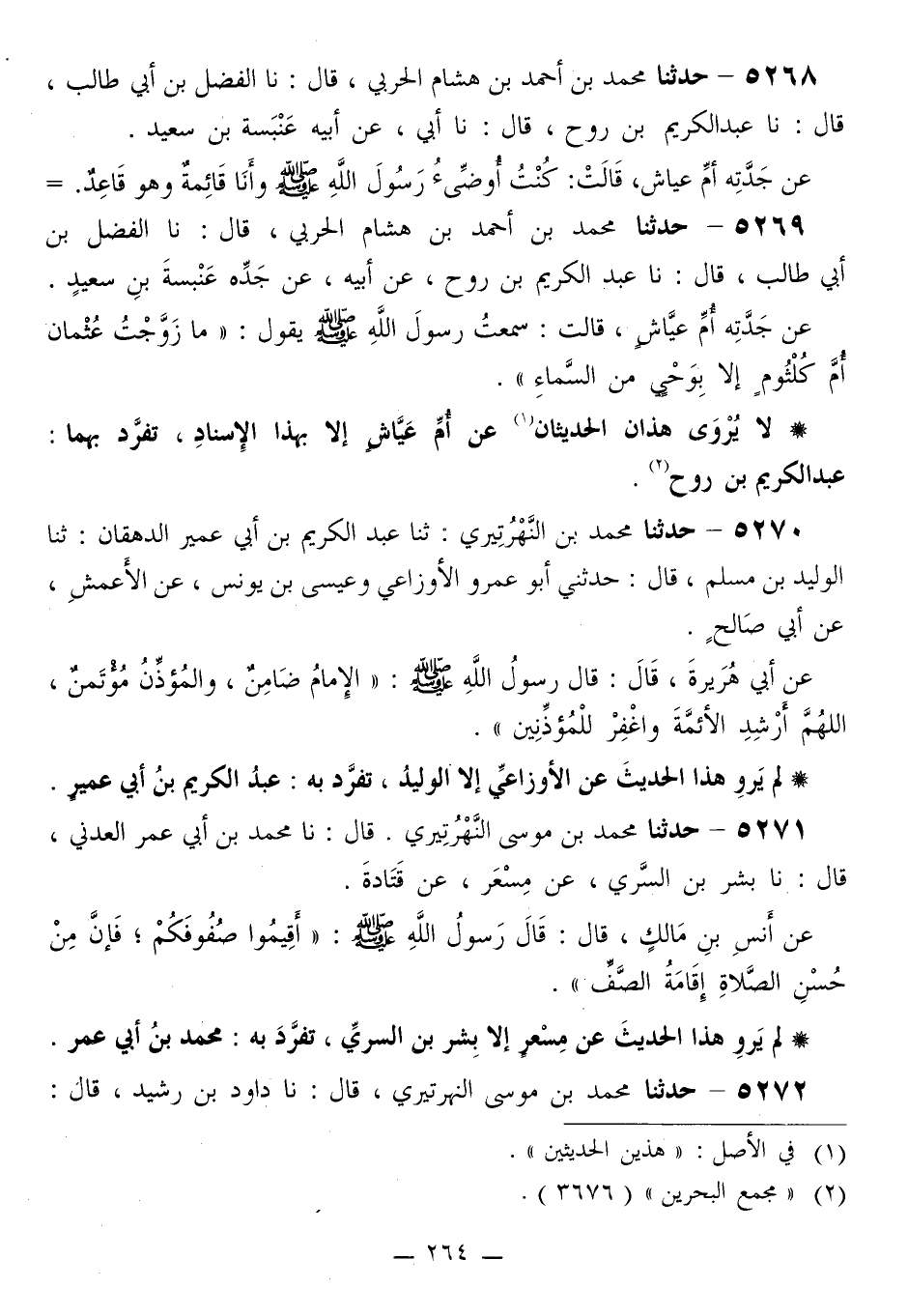 5269 - حَدَّثَنَا مُحَمَّدُ بْنُ هِشَامٍ الْحَرْبِيُّ قَالَ: نَا الْفَضْلُ بْنُ أَبِي طَالِبٍ قَالَ: نَا عَبْدُ الْكَرِيمِ بْنُ رَوْحٍ، عَنْ أَبِيهِ، عَنْ جَدِّهِ عَنْبَسَةَ بْنِ سَعِيدٍ، عَنْ جَدَّتِهِ أُمِّ عَيَّاشٍ، قَالَتْ: سَمِعْتُ رَسُولَ اللَّهِ صَلَّى اللهُ عَلَيْهِ وَسَلَّمَ يَقُولُ: «§مَا زَوَّجْتُ عُثْمَانَ أُمَّ كُلْثُومٍ إِلَّا بِوَحْيٍ مِنَ السَّمَاءِ»