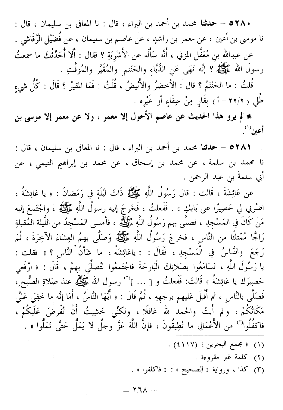 5281 - حَدَّثَنَا مُحَمَّدُ بْنُ أَحْمَدَ بْنِ الْبَرَاءِ قَالَ: نَا الْمُعَافَى بْنُ سُلَيْمَانَ قَالَ: نَا مُحَمَّدُ بْنُ سَلَمَةَ، عَنْ مُحَمَّدِ بْنِ إِسْحَاقَ، عَنْ مُحَمَّدِ بْنِ إِبْرَاهِيمَ التَّيْمِيِّ، عَنْ أَبِي سَلَمَةَ بْنِ عَبْدِ الرَّحْمَنِ، عَنْ عَائِشَةَ، قَالَتْ: قَالَ رَسُولُ اللَّهِ صَلَّى اللهُ عَلَيْهِ وَسَلَّمَ ذَاتَ لَيْلَةٍ فِي رَمَضَانَ: «يَا عَائِشَةُ، اضْرِبِي لِي حَصِيرًا عَلَى بَابِكِ» . فَفَعَلْتُ، فَخَرَجَ إِلَيْهِ رَسُولُ اللَّهِ صَلَّى اللهُ عَلَيْهِ وَسَلَّمَ، وَاجْتَمَعَ إِلَيْهِ مَنْ كَانَ فِي الْمَسْجِدِ، فَصَلَّى بِهِمْ رَسُولُ اللَّهِ صَلَّى اللهُ عَلَيْهِ وَسَلَّمَ، فَأَمْسَى الْمَسْجِدُ مِنَ اللَّيْلَةِ الْمُقْبِلَةِ رَاجًّا مُمْتَلِئًا مِنَ النَّاسِ، فَخَرَجَ رَسُولُ اللَّهِ صَلَّى اللهُ عَلَيْهِ وَسَلَّمَ وَصَلَّى بِهِمُ الْعِشَاءَ الْآخِرَةَ، ثُمَّ رَجَعَ وَالنَّاسُ فِي الْمَسْجِدِ، فَقَالَ: «يَا عَائِشَةُ، مَا شَأْنُ النَّاسِ؟» ، فَقُلْتُ: يَا رَسُولَ اللَّهِ، تَسَامَعُوا بِصَلَاتِكَ الْبَارِحَةَ فَاجْتَمَعُوا لِتُصَلِّيَ بِهِمْ. قَالَ: «ارْفَعِي حَصِيرَكِ يَا عَائِشَةُ» . قَالَتْ: فَفَعَلْتُ وَرَسُولُ اللَّهِ صَلَّى اللهُ عَلَيْهِ وَسَلَّمَ عِنْدَ صَلَاةِ الصُّبْحِ، فَصَلَّى بِالنَّاسِ، ثُمَّ أَقْبَلَ عَلَيْهِمْ بِوَجْهِهِ، ثُمَّ قَالَ: «أَيُّهَا النَّاسُ، §أَمَا إِنَّهُ مَا خَفِيَ عَلَيَّ مَكَانُكُمْ، وَلَمْ أَبِتْ وَالْحَمْدُ لِلَّهِ غَافِلًا، وَلَكِنِّي خَشِيتُ أَنْ تُفْرَضَ عَلَيْكُمْ، فَاكْفُلُوا مِنَ الْأَعْمَالِ مَا تُطِيقُونَ، فَإِنَّ اللَّهَ عَزَّ وَجَلَّ لَا يَمَلُّ حَتَّى تَمَلُّوا»