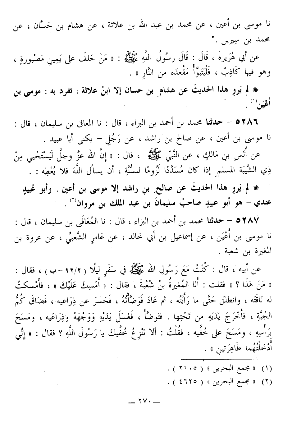5287 - حَدَّثَنَا مُحَمَّدُ بْنُ أَحْمَدَ بْنِ الْبَرَاءِ قَالَ: نَا الْمُعَافَى بْنُ سُلَيْمَانَ قَالَ: نَا مُوسَى بْنُ أَعْيَنَ، عَنْ إِسْمَاعِيلَ بْنِ أَبِي خَالِدٍ، عَنْ عَامِرٍ الشَّعْبِيِّ، عَنْ عُرْوَةَ بْنِ الْمُغِيرَةِ بْنِ شُعْبَةَ، عَنْ أَبِيهِ قَالَ: كُنْتُ مَعَ رَسُولِ اللَّهِ صَلَّى اللهُ عَلَيْهِ وَسَلَّمَ فِي سَفَرٍ لَيْلًا، فَقَالَ: «مَنْ هَذَا؟» فَقُلْتُ: أَنَا الْمُغِيرَةُ بْنُ شُعْبَةَ، فَقَالَ: «أَمْسِكْ عَلَيْكَ» ، فَأَمْسَكْتُ لَهُ نَاقَتَهُ، وَانْطَلَقَ حَتَّى مَا رَأَيْتُهُ، ثُمَّ عَادَ فَوَضَّأْتُهُ، «فَحَسَرَ عَنْ ذِرَاعَيْهِ، فَضَاقَ كُمُّ الْجُبَّةِ، فَأَخْرَجَ يَدَيْهِ مِنْ تَحْتِهَا فَتَوَضَّأَ، §فَغَسَلَ يَدَيْهِ وَوَجْهَهُ وَذِرَاعَيْهِ، وَمَسَحَ بِرَأْسِهِ، وَمَسَحَ عَلَى خُفَّيْهِ» . فَقُلْتُ: إِلَّا تَنْزِعُ خُفَّيْكَ يَا رَسُولَ اللَّهِ؟ فَقَالَ: «إِنِّي أَدْخَلْتُهُمَا طَاهِرَتَيْنِ» -[271]- لَمْ يُجَوِّدْ هَذَا الْحَدِيثَ عَنْ إِسْمَاعِيلَ بْنِ أَبِي خَالِدٍ إِلَّا مُوسَى بْنُ أَعْيَنَ، تَفَرَّدَ بِهِ: الْمُعَافَى بْنُ سُلَيْمَانَ «. وَرَوَاهُ الْمُعَافَى أَيْضًا: عَنِ الْقَاسِمِ، عَنْ مَعْنٍ، عَنْ إِسْمَاعِيلَ بْنِ أَبِي خَالِدٍ، عَنِ الشَّعْبِيِّ، عَنِ الْمُغِيرَةِ بْنِ شُعْبَةَ، وَلَمْ يَذْكُرْ:» عُرْوَةَ بْنَ الْمُغِيرَةِ "