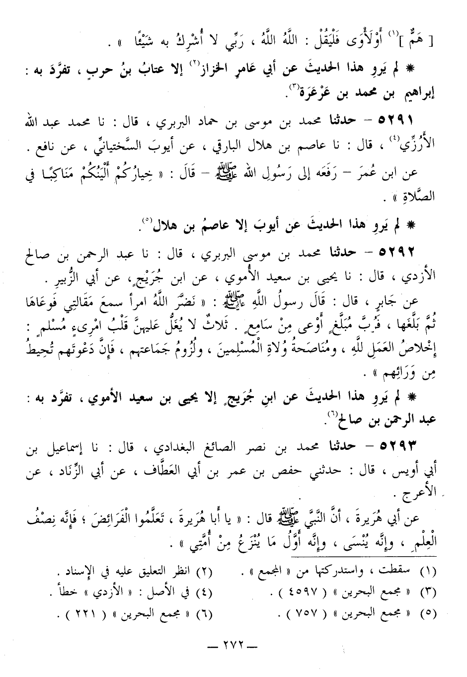 5293 - حَدَّثَنَا مُحَمَّدُ بْنُ نَصْرٍ الصَّائِغُ الْبَغْدَادِيُّ قَالَ: نَا إِسْمَاعِيلُ بْنُ أَبِي أُوَيْسٍ قَالَ: حَدَّثَنِي حَفْصُ بْنُ عُمَرَ بْنِ أَبِي الْعَطَّافِ، عَنْ أَبِي الزِّنَادِ، عَنِ الْأَعْرَجِ، عَنْ أَبِي هُرَيْرَةَ، أَنَّ النَّبِيَّ صَلَّى اللهُ عَلَيْهِ وَسَلَّمَ قَالَ: «يَا أَبَا هُرَيْرَةَ، §تَعَلَّمُوا الْفَرَائِضَ، فَإِنَّهُ نِصْفُ الْعِلْمِ، وَإِنَّهُ يُنْسَى، وَإِنَّهُ أَوَّلُ مَا يُنْزَعُ مِنْ أُمَّتِي»