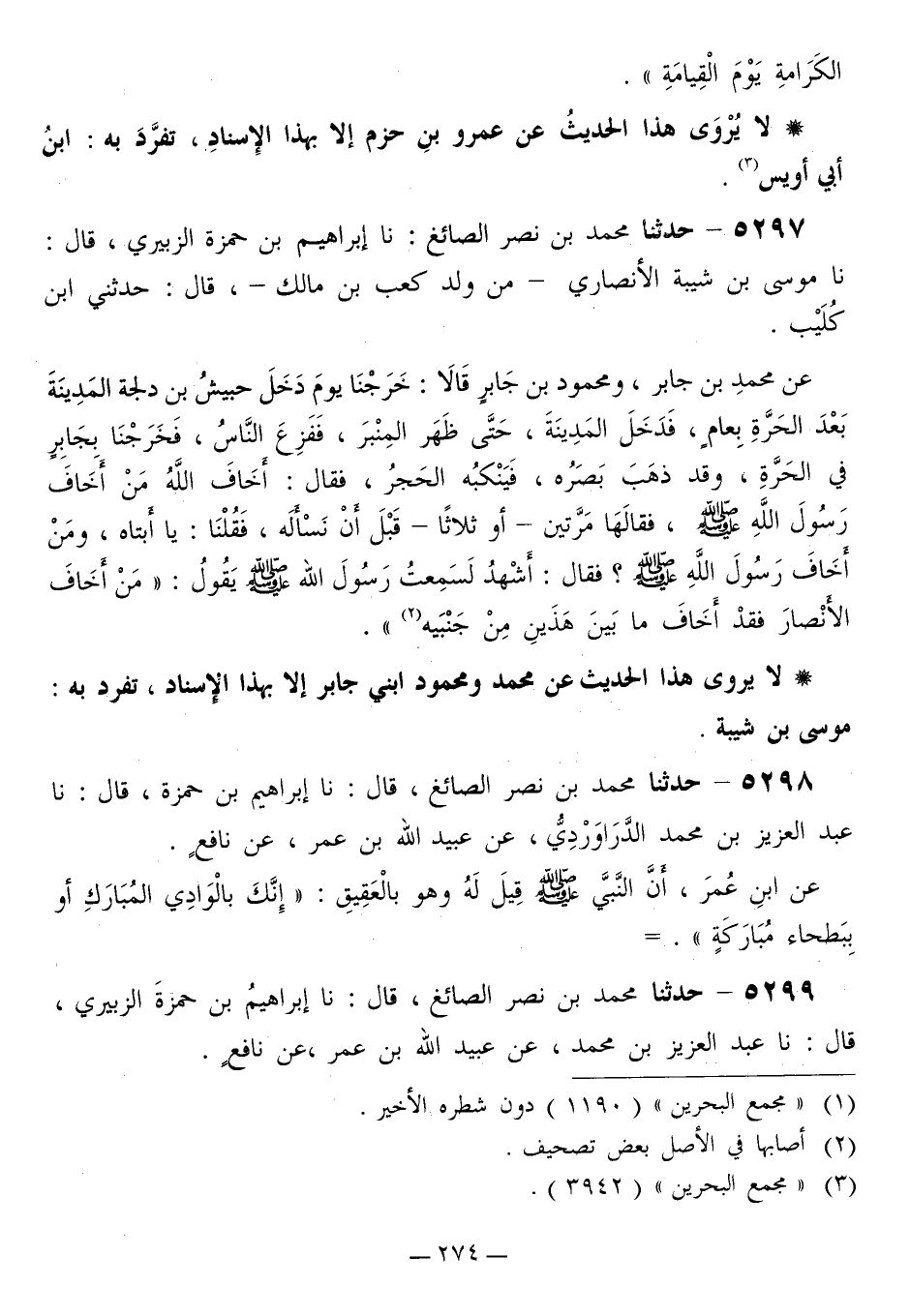5297 - حَدَّثَنَا مُحَمَّدُ بْنُ نَصْرٍ الصَّائِغُ، نَا إِبْرَاهِيمُ بْنُ حَمْزَةَ الزُّبَيْرِيُّ قَالَ: نا مُوسَى بْنُ شَيْبَةَ الْأَنْصَارِيُّ، مِنْ وَلَدِ كَعْبِ بْنِ مَالِكٍ قَالَ: حَدَّثَنِي ابْنُ كُلَيْبٍ، عَنْ مُحَمَّدِ بْنِ جَابِرٍ، وَمَحْمُودِ بْنِ جَابِرٍ قَالَا: خَرَجْنَا يَوْمَ دَخَلَ حُبَيْشُ بْنُ دُلْجَةَ الْمَدِينَةَ بَعْدَ الْحَرَّةِ بِعَامٍ، فَدَخَلَ الْمَدِينَةَ حَتَّى ظَهْرَ الْمِنْبَرِ، فَفَزِعَ النَّاسُ فَخَرَجْنَا بِجَابِرٍ فِي الْحَرَّةِ، وَقَدْ ذَهَبَ بَصَرُهُ، فَيَنْكُبُهُ الْحَجَرُ، فَقَالَ: أَخَافَ اللَّهَ مَنْ أَخَافَ رَسُولَ اللَّهِ صَلَّى اللهُ عَلَيْهِ وَسَلَّمَ، فَقَالَهَا مَرَّتَيْنِ، أَوْ ثَلَاثًا قَبْلَ أَنْ نَسْأَلَهُ، فَقُلْنَا: يَا أَبَتَاهُ، وَمَنْ أَخَافَ رَسُولَ اللَّهِ صَلَّى اللهُ عَلَيْهِ وَسَلَّمَ؟ فَقَالَ: أَشْهَدُ لَسَمِعْتُ رَسُولَ اللَّهِ صَلَّى اللهُ عَلَيْهِ وَسَلَّمَ يَقُولُ: «§مَنْ أَخَافَ الْأَنْصَارَ فَقَدْ أَخَافَ مَا بَيْنَ هَذَيْنِ مِنْ جَنْبَيْهِ»