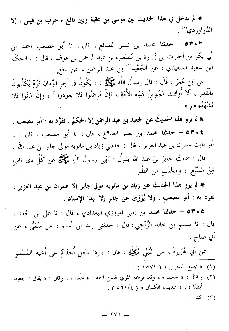 5303 - حَدَّثَنَا مُحَمَّدُ بْنُ نَصْرٍ الصَّائِغُ قَالَ: نَا أَبُو مُصْعَبٍ أَحْمَدُ بْنُ أَبِي بَكْرِ بْنِ الْحَارِثِ بْنِ زُرَارَةَ بْنِ مُصْعَبِ بْنِ عَبْدِ الرَّحْمَنِ بْنِ عَوْفٍ قَالَ: نَا الْحَكَمُ بْنُ سَعِيدٍ السَّعِيدِيُّ، عَنِ الْجُعَيْدِ بْنِ عَبْدِ الرَّحْمَنِ، عَنْ نَافِعٍ، عَنِ ابْنِ عُمَرَ قَالَ: قَالَ رَسُولُ اللَّهِ صَلَّى اللهُ عَلَيْهِ وَسَلَّمَ: «§يَكُونُ فِي آخِرِ الزَّمَانِ قَوْمٌ يُكَذِّبُونَ بِالْقَدَرِ، أَلَا أُولَئِكِ مَجُوسُ هَذِهِ الْأُمَّةِ، فَإِنْ مَرِضُوا فَلَا يَعُودُوا، وَإِنْ مَاتُوا فَلَا تَشْهَدُوهُمْ»