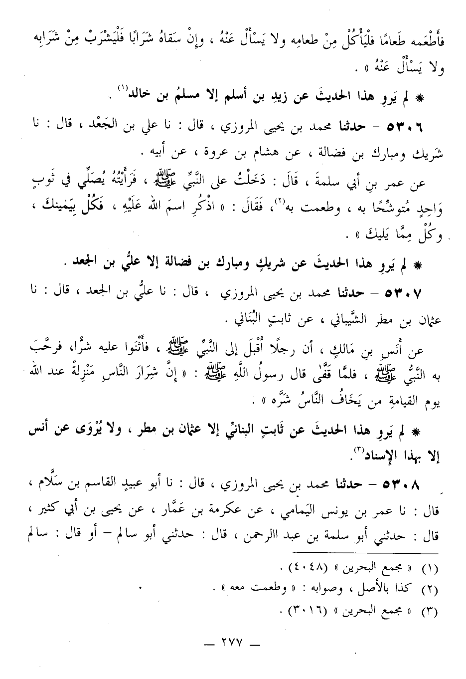 5307 - حَدَّثَنَا مُحَمَّدُ بْنُ يَحْيَى الْمَرْوَزِيُّ قَالَ: نَا عَلِيُّ بْنُ الْجَعْدِ قَالَ: نَا عُثْمَانُ بْنُ مَطَرٍ الشَّيْبَانِيُّ، عَنْ ثَابِتٍ الْبُنَانِيِّ، عَنْ أَنَسِ بْنِ مَالِكٍ، أَنَّ رَجُلًا أَقْبَلَ إِلَى النَّبِيِّ صَلَّى اللهُ عَلَيْهِ وَسَلَّمَ، فَأَثْنَوْا عَلَيْهِ شَرًّا، فَرَحَّبَ بِهِ النَّبِيُّ صَلَّى اللهُ عَلَيْهِ وَسَلَّمَ، فَلَمَّا قَفَّى قَالَ رَسُولُ اللَّهِ صَلَّى اللهُ عَلَيْهِ وَسَلَّمَ: «إِنَّ §شِرَارَ النَّاسِ مَنْزِلَةً عِنْدَ اللَّهِ يَوْمَ الْقِيَامَةِ مَنْ يَخَافُ النَّاسُ شَرَّهُ»