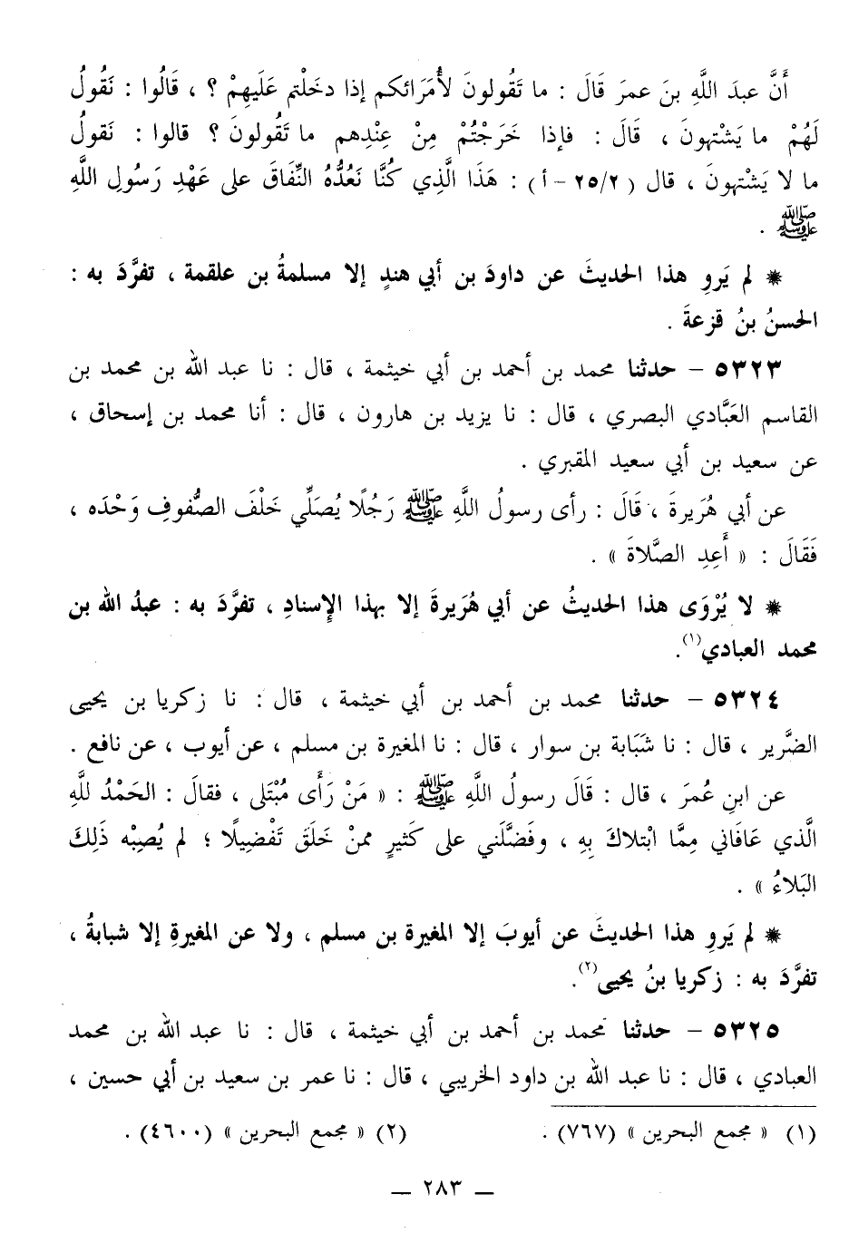 5324 - حَدَّثَنَا مُحَمَّدُ بْنُ أَحْمَدَ بْنِ أَبِي خَيْثَمَةَ قَالَ: نَا زَكَرِيَّا بْنُ يَحْيَى الضَّرِيرُ قَالَ: نَا شَبَابَةُ بْنُ سَوَّارٍ قَالَ: نَا الْمُغِيرَةُ بْنُ مُسْلِمٍ، عَنْ أَيُّوبَ، عَنْ نَافِعٍ، عَنِ ابْنِ عُمَرَ قَالَ: قَالَ رَسُولُ اللَّهِ صَلَّى اللهُ عَلَيْهِ وَسَلَّمَ: «§مَنْ رَأَى مُبْتَلًى، فَقَالَ: الْحَمْدُ لِلَّهِ الَّذِي عَافَانِي مِمَّا ابْتَلَاكَ بِهِ، وَفَضَّلَنِي عَلَى كَثِيرٍ مِمَّنْ خَلَقَ تَفْضِيلًا لَمْ يُصِبْهُ ذَلِكَ الْبَلَاءُ»