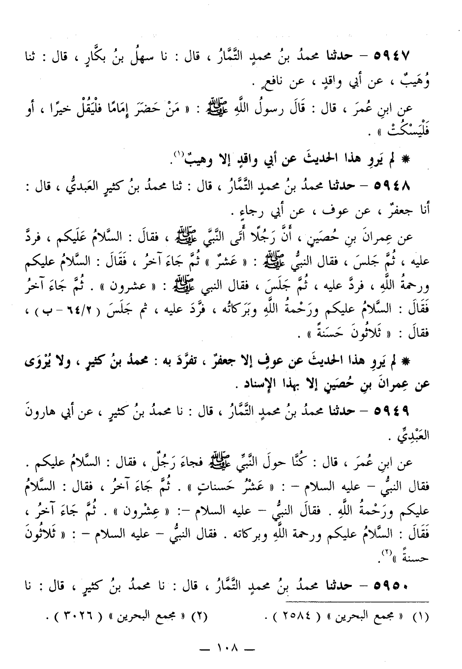 5948 - حَدَّثَنَا مُحَمَّدُ بْنُ مُحَمَّدٍ التَّمَّارُ قَالَ: ثَنَا مُحَمَّدُ بْنُ كَثِيرٍ الْعَبْدِيُّ قَالَ: أَنَا جَعْفَرٌ، عَنْ عَوْفٍ، عَنْ أَبِي رَجَاءٍ، عَنْ عِمْرَانَ بْنِ حُصَيْنٍ، أَنَّ رَجُلًا أَتَى النَّبِيَّ صَلَّى اللهُ عَلَيْهِ وَسَلَّمَ فَقَالَ: §السَّلَامُ عَلَيْكُمْ، فَرَدَّ عَلَيْهِ، ثُمَّ جَلَسَ، فَقَالَ النَّبِيُّ صَلَّى اللهُ عَلَيْهِ وَسَلَّمَ: «عَشْرٌ» . ثُمَّ جَاءَ آخَرُ فَقَالَ: السَّلَامُ عَلَيْكُمْ وَرَحْمَةُ اللَّهِ، فَرَدَّ عَلَيْهِ، ثُمَّ جَلَسَ، فَقَالَ النَّبِيُّ صَلَّى اللهُ عَلَيْهِ وَسَلَّمَ: «عِشْرُونَ» . ثُمَّ جَاءَ آخَرُ فَقَالَ: السَّلَامُ عَلَيْكُمْ وَرَحْمَةُ اللَّهِ وَبَرَكَاتُهُ، فَرَدَّ عَلَيْهِ، ثُمَّ جَلَسَ، فَقَالَ: «ثَلَاثُونَ حَسَنَةً»