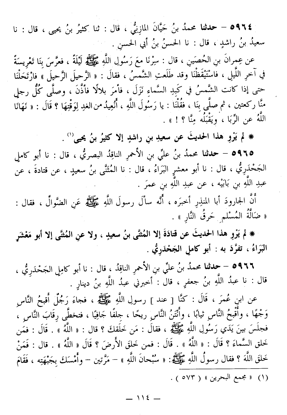 5964 - حَدَّثَنَا مُحَمَّدُ بْنُ حَيَّانَ الْمَازِنِيُّ قَالَ: ثَنَا كَثِيرُ بْنُ يَحْيَى قَالَ: نا سَعِيدُ بْنُ رَاشِدٍ قَالَ: نا الْحَسَنُ بْنُ أَبِي الْحَسَنِ، عَنْ عِمْرَانَ بْنِ الْحُصَيْنِ قَالَ: سِرْنَا مَعَ رَسُولِ اللَّهِ صَلَّى اللهُ عَلَيْهِ وَسَلَّمَ لَيْلَةً، فَعَرَّسَ بِنَا تَعْرِيسَةً فِي آخِرِ اللَّيْلِ، فَاسْتَيْقَظْنَا، وَقَدْ طَلَعَتِ الشَّمْسُ، فَقَالَ: «الرَّحِيلُ الرَّحِيلُ» ، فَارْتَحَلْنَا حَتَّى إِذَا كَانَتِ الشَّمْسُ فِي كَبِدِ السَّمَاءِ نَزَلَ، فَأَمَرَ بِلَالًا فَأَذَّنَ، وَصَلَّى كُلُّ رَجُلٍ مِنَّا رَكْعَتَيْنِ، ثُمَّ صَلَّى بِنَا، فَقُلْنَا: يَا رَسُولَ اللَّهِ، أَنُعِيدُ مِنَ الْغَدِ لِوَقْتِهَا؟ قَالَ: «§نَهَانَا اللَّهُ عَنِ الرِّبَا، وَيَقْبَلُهُ مِنَّا؟»