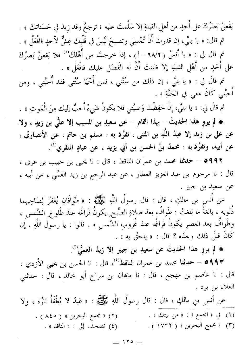 5992 - حَدَّثَنَا مُحَمَّدُ بْنُ عِمْرَانَ النَّاقِطُ قَالَ: نا يَحْيَى بْنُ حَبِيبِ بْنِ عَرَبِيٍّ قَالَ: نا مَرْحُومُ بْنُ عَبْدِ الْعَزِيزِ الْعَطَّارُ، عَنْ عَبْدِ الرَّحِيمِ بْنِ زَيْدٍ الْعَمِّيِّ، عَنْ أَبِيهِ، عَنْ سَعِيدِ بْنِ جُبَيْرٍ، عَنْ أَنَسِ بْنِ مَالِكٍ قَالَ: قَالَ رَسُولُ اللَّهِ صَلَّى اللهُ عَلَيْهِ وَسَلَّمَ: «§طَوَافَانِ يُغْفَرُ لِصَاحِبِهِمَا ذُنُوبُهُ بَالِغَةً مَا بَلَغَتْ: طَوَافٌ بَعْدَ صَلَاةِ الصُّبْحِ يَكُونُ فَرَاغُهُ عِنْدَ طُلُوعِ الشَّمْسِ، وَطَوَافٌ بَعْدَ الْعَصْرِ يَكُونُ فَرَاغُهُ عِنْدَ غُرُوبِ الشَّمْسِ» قَالُوا: يَا رَسُولَ اللَّهِ، إِنْ كَانَ قَبْلَ ذَلِكَ وَبَعْدَهُ؟ قَالَ: «يَلْحَقُ بِهِ»