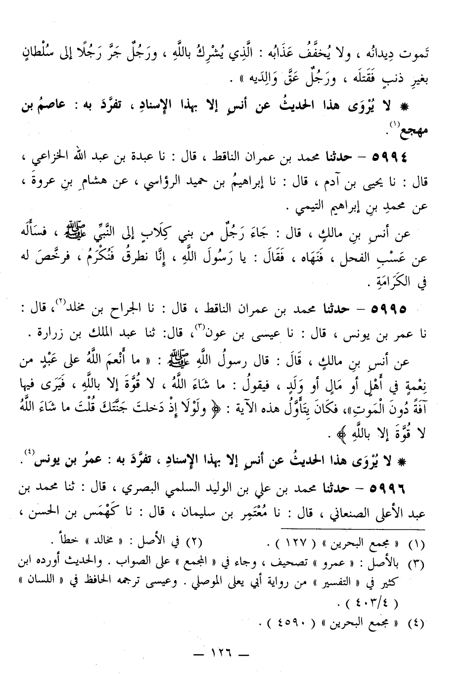 5995 - حَدَّثَنَا مُحَمَّدُ بْنُ عِمْرَانَ النَّاقِطُ قَالَ: نا الْجَرَّاحُ بْنُ مَخْلَدٍ قَالَ: نا عُمَرُ بْنُ يُونُسَ قَالَ: نا عِيسَى بْنُ عَوْنٍ قَالَ: ثَنَا عَبْدُ الْمَلِكِ بْنُ زُرَارَةَ، عَنْ أَنَسِ بْنِ مَالِكٍ قَالَ: قَالَ رَسُولُ اللَّهِ صَلَّى اللهُ عَلَيْهِ وَسَلَّمَ: «§مَا أَنْعَمَ اللَّهُ عَلَى عَبْدٍ مِنْ نِعْمَةٍ فِي أَهْلٍ أَوْ مَالٍ أَوْ وَلَدٍ، فَيَقُولُ: مَا شَاءَ اللَّهُ، لَا قُوَّةَ إِلَّا بِاللَّهِ، فَيَرَى فِيهَا آفَةً دُونَ الْمَوْتِ» ، فَكَانَ يَتَأَوَّلُ هَذِهِ الْآيَةَ: {وَلَوْلَا إِذْ دَخَلْتَ جَنَّتَكَ قُلْتَ مَا شَاءَ اللَّهُ لَا قُوَّةَ إِلَّا بِاللَّهِ} [الكهف: 39] «