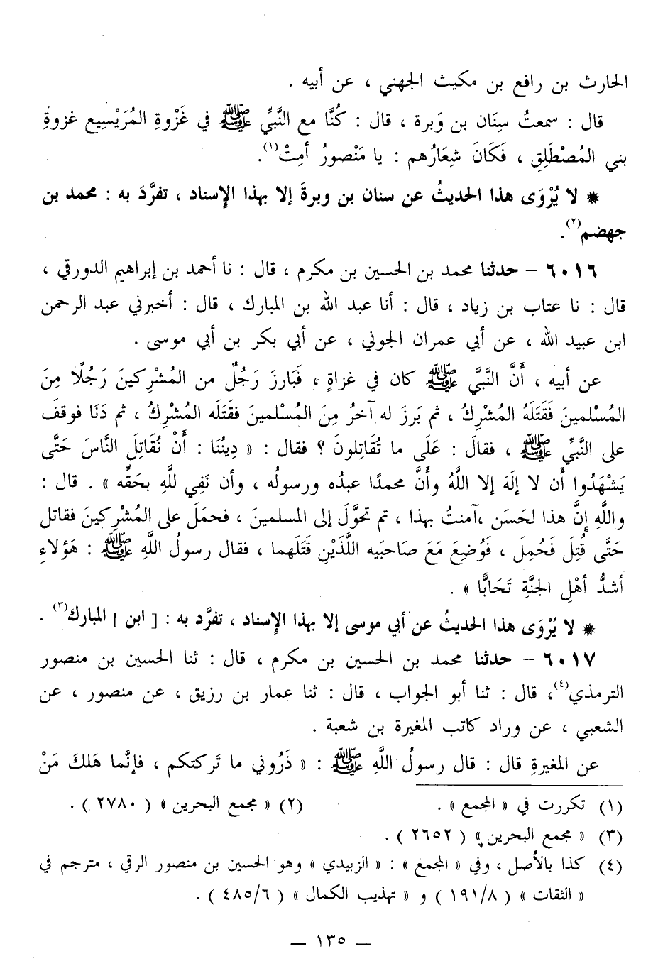 6016 - حَدَّثَنَا مُحَمَّدُ بْنُ الْحُسَيْنِ بْنِ مُكْرَمٍ قَالَ: نا أَحْمَدُ بْنُ إِبْرَاهِيمَ الدَّوْرَقِيُّ قَالَ: نا عَتَّابُ بْنُ زِيَادٍ قَالَ: نا عَبْدُ اللَّهِ بْنُ الْمُبَارَكِ قَالَ: أَخْبَرَنِي عَبْدُ الرَّحْمَنِ بْنُ عُبَيْدِ اللَّهِ، عَنْ أَبِي عِمْرَانَ الْجَوْنِيِّ، عَنْ أَبِي بَكْرِ بْنِ أَبِي مُوسَى، عَنْ أَبِيهِ، أَنَّ النَّبِيَّ صَلَّى اللهُ عَلَيْهِ وَسَلَّمَ كَانَ فِي غَزَاةٍ، فَبَارَزَ رَجُلٌ مِنَ الْمُشْرِكِينَ رَجُلًا مِنَ الْمُسْلِمِينَ فَقَتَلَهُ الْمُشْرِكُ، ثُمَّ بَرَزَ لَهُ آخَرُ مِنَ الْمُسْلِمِينَ فَقَتَلَهُ الْمُشْرِكُ، ثُمَّ دَنَا فَوَقَفَ عَلَى النَّبِيِّ صَلَّى اللهُ عَلَيْهِ وَسَلَّمَ، فَقَالَ: عَلَى مَا تُقَاتِلُونَ؟ فَقَالَ: «§دِينُنَا: أَنْ نُقَاتِلَ النَّاسَ حَتَّى يَشْهَدُوا أَنْ لَا إِلَهَ إِلَّا اللَّهُ، وَأَنَّ مُحَمَّدًا عَبْدُهُ وَرَسُولُهُ، وَإِنْ نَفَى لِلَّهِ بِحَقِّهِ» قَالَ: وَاللَّهِ إِنَّ هَذَا لَحَسَنٌ، آمَنْتُ بِهَذَا، ثُمَّ تُحَوَّلَ إِلَى الْمُسْلِمِينَ، فَحَمَلَ عَلَى الْمُشْرِكِينَ فَقَاتَلَ حَتَّى قُتِلَ فَحُمِلَ، فَوُضِعَ مَعَ صَاحِبَيْهِ اللَّذَيْنِ قَتَلَهُمَا، فَقَالَ رَسُولُ اللَّهِ صَلَّى اللهُ عَلَيْهِ وَسَلَّمَ: «هَؤُلَاءِ أَشَدُّ أَهْلِ الْجَنَّةِ تَحَابًّا»