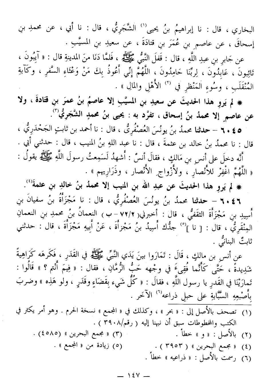 6046 - حَدَّثَنَا مُحَمَّدُ بْنُ يُونُسَ الْعُصْفُرِيُّ قَالَ: نا مَجْزَأَةُ بْنُ سُفْيَانَ بْنِ أُسَيْدِ بْنِ مَجْزَأَةَ الثَّقَفِيُّ قَالَ: أَخْبَرَنِي النُّعْمَانُ بْنُ مُحَمَّدِ بْنِ النُّعْمَانِ الْمِنْقَرِيُّ قَالَ: نا جَدُّكَ أُسَيْدُ بْنُ مَجْزَأَةَ، عَنْ أَبِيهِ مَجْزَأَةَ قَالَ: حَدَّثَنِي ثَابِتٌ الْبُنَانِيُّ، عَنْ أَنَسِ بْنِ مَالِكٍ قَالَ: تَمَارَوْا بَيْنَ يَدَيِ النَّبِيِّ صَلَّى اللهُ عَلَيْهِ وَسَلَّمَ فِي الْقَدَرِ، فَكَرِهَهُ كَرَاهِيَةً شَدِيدَةً، حَتَّى كَأَنَّمَا فُقِئَ فِي وَجْهِهِ حَبُّ الرُّمَّانِ، فَقَالَ: «فِيمَ أَنْتُمْ؟» قَالُوا: تَمَارَيْنَا فِي الْقَدَرِ يَا رَسُولَ اللَّهِ، فَقَالَ: «§كُلُّ شَيْءٍ بِقَضَاءٍ وَقَدَرٍ، وَلَوْ هَذِهِ» وَضَرَبَ بِأُصْبُعِهِ السَّبَّابَةَ عَلَى حَبْلِ ذِرَاعِهِ الْآخَرِ «-[148]- لَمْ يَرْوِ مَجْزَأَةُ أَبُو أُسَيْدٍ الثَّقَفِيُّ عَنْ ثَابِتٍ الْبُنَانِّيِّ إِلَّا هَذَا الْحَدِيثَ، تَفَرَّدَ بِهِ وَلَدُهُ»