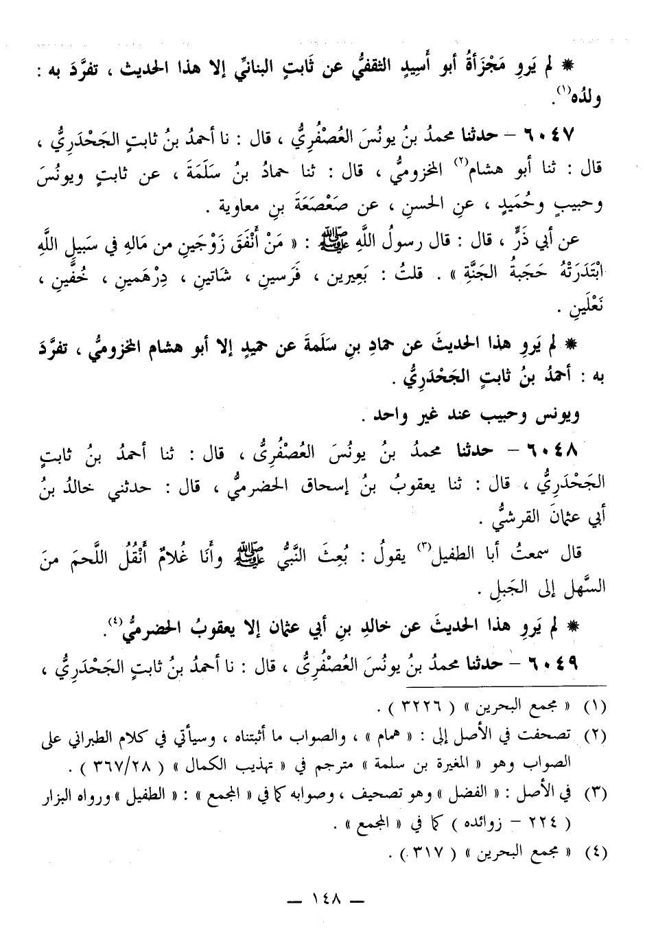 6047 - حَدَّثَنَا مُحَمَّدُ بْنُ يُونُسَ الْعُصْفُرِيُّ قَالَ: نا أَحْمَدُ بْنُ ثَابِتٍ الْجَحْدَرِيُّ قَالَ: ثَنَا أَبُو هِشَامٍ الْمَخْزُومِيُّ قَالَ: ثَنَا حَمَّادُ بْنُ سَلَمَةَ، عَنْ ثَابِتٍ، وَيُونُسَ، وَحَبِيبٍ، وَحُمَيْدٍ، عَنِ الْحَسَنِ، عَنْ صَعْصَعَةَ بْنِ مُعَاوِيَةَ، عَنْ أَبِي ذَرٍّ قَالَ: قَالَ رَسُولُ اللَّهِ صَلَّى اللهُ عَلَيْهِ وَسَلَّمَ: «§مَنْ أَنْفَقَ زَوْجَيْنِ مِنْ مَالِهِ فِي سَبِيلِ اللَّهِ ابْتَدَرَتْهُ حَجَبَةُ الْجَنَّةِ» ، قُلْتُ: «بَعِيرَيْنِ، فَرَسَيْنِ، شَاتَيْنِ، دِرْهَمَيْنِ، خُفَّيْنِ، نَعْلَيْنِ»