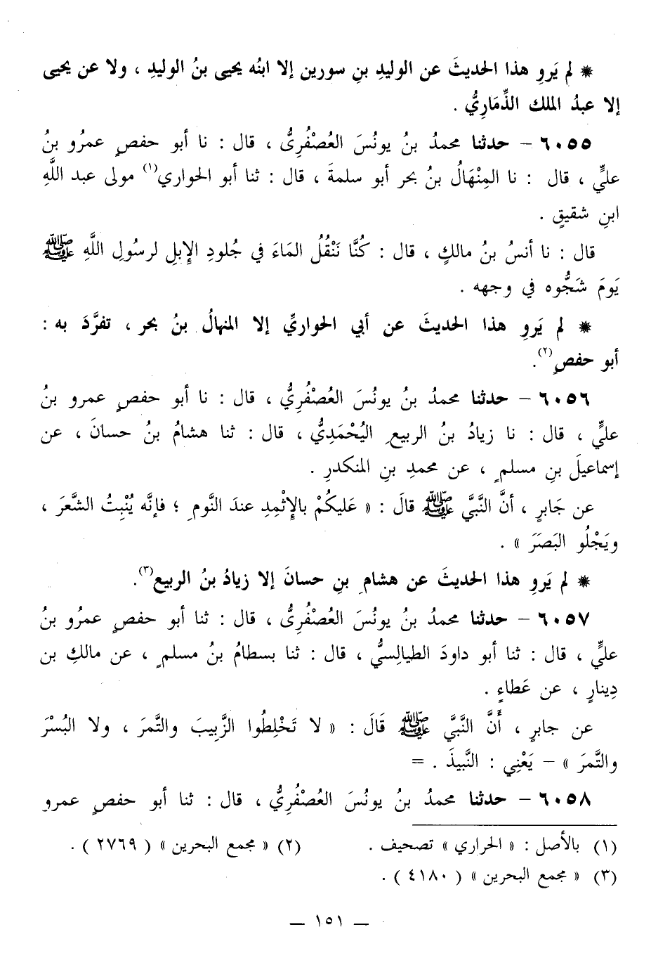 6056 - حَدَّثَنَا مُحَمَّدُ بْنُ يُونُسَ الْعُصْفُرِيُّ قَالَ: نا أَبُو حَفْصٍ عَمْرُو بْنُ عَلِيٍّ قَالَ: نا زِيَادُ بْنُ الرَّبِيعِ الْيُحْمَدِيُّ قَالَ: ثَنَا هِشَامُ بْنُ حَسَّانَ، عَنْ إِسْمَاعِيلَ بْنِ مُسْلِمٍ، عَنْ مُحَمَّدِ بْنِ الْمُنْكَدِرِ، عَنْ جَابِرٍ، أَنَّ النَّبِيَّ صَلَّى اللهُ عَلَيْهِ وَسَلَّمَ قَالَ: «§عَلَيْكُمْ بِالْإِثْمِدِ عِنْدَ النَّوْمِ، فَإِنَّهُ يُنْبِتُ الشَّعَرَ، وَيَجْلُو الْبَصَرَ»