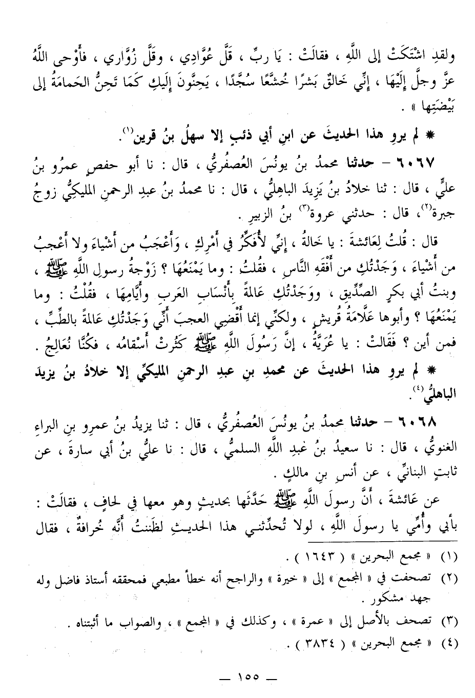 6067 - حَدَّثَنَا مُحَمَّدُ بْنُ يُونُسَ الْعُصْفُرِيُّ قَالَ: نا أَبُو حَفْصٍ عَمْرُو بْنُ عَلِيٍّ قَالَ: ثَنَا خَلَّادُ بْنُ يَزِيدَ الْبَاهِلِيُّ قَالَ: نا مُحَمَّدُ بْنُ عَبْدِ الرَّحْمَنِ الْمُلَيْكِيُّ، زَوْجُ جَبْرَةَ قَالَ: حَدَّثَنِي عُرْوَةُ بْنُ الزُّبَيْرِ قَالَ: قُلْتُ لِعَائِشَةَ، يَا خَالَةُ، إِنِّي لَأُفَكِّرُ فِي أَمْرِكِ، وَأَعْجَبُ مِنْ أَشْيَاءَ، وَلَا أَعْجَبُ مِنْ أَشْيَاءَ، وَجَدَّتُكِ مِنْ أَفْقَهِ النَّاسِ، فَقُلْتُ: وَمَا يَمْنَعُهَا؟ زَوْجَةُ رَسُولِ اللَّهِ صَلَّى اللهُ عَلَيْهِ وَسَلَّمَ، وَبِنْتُ أَبِي بَكْرٍ الصِّدِّيقِ، وَوَجَدْتُكِ عَالِمَةً بِأَنْسَابِ الْعَرَبِ وَأَيَّامِهَا، فَقُلْتُ: وَمَا يَمْنَعُهَا؟ وَأَبُوهَا عَلَّامَةُ قُرَيْشٍ، وَلَكِنِّي إِنَّمَا أَقْضِي الْعَجَبَ أَنِّي وَجَدَّتُكِ عَالِمَةً بِالطِّبِّ، فَمِنْ أَيْنَ؟ فَقَالَتْ: يَا عُرَيَّةُ، إِنَّ رَسُولَ اللَّهِ صَلَّى اللهُ عَلَيْهِ وَسَلَّمَ: «§كَثُرَتْ أَسْقَامُهُ، فَكُنَّا نُعَالِجُ»